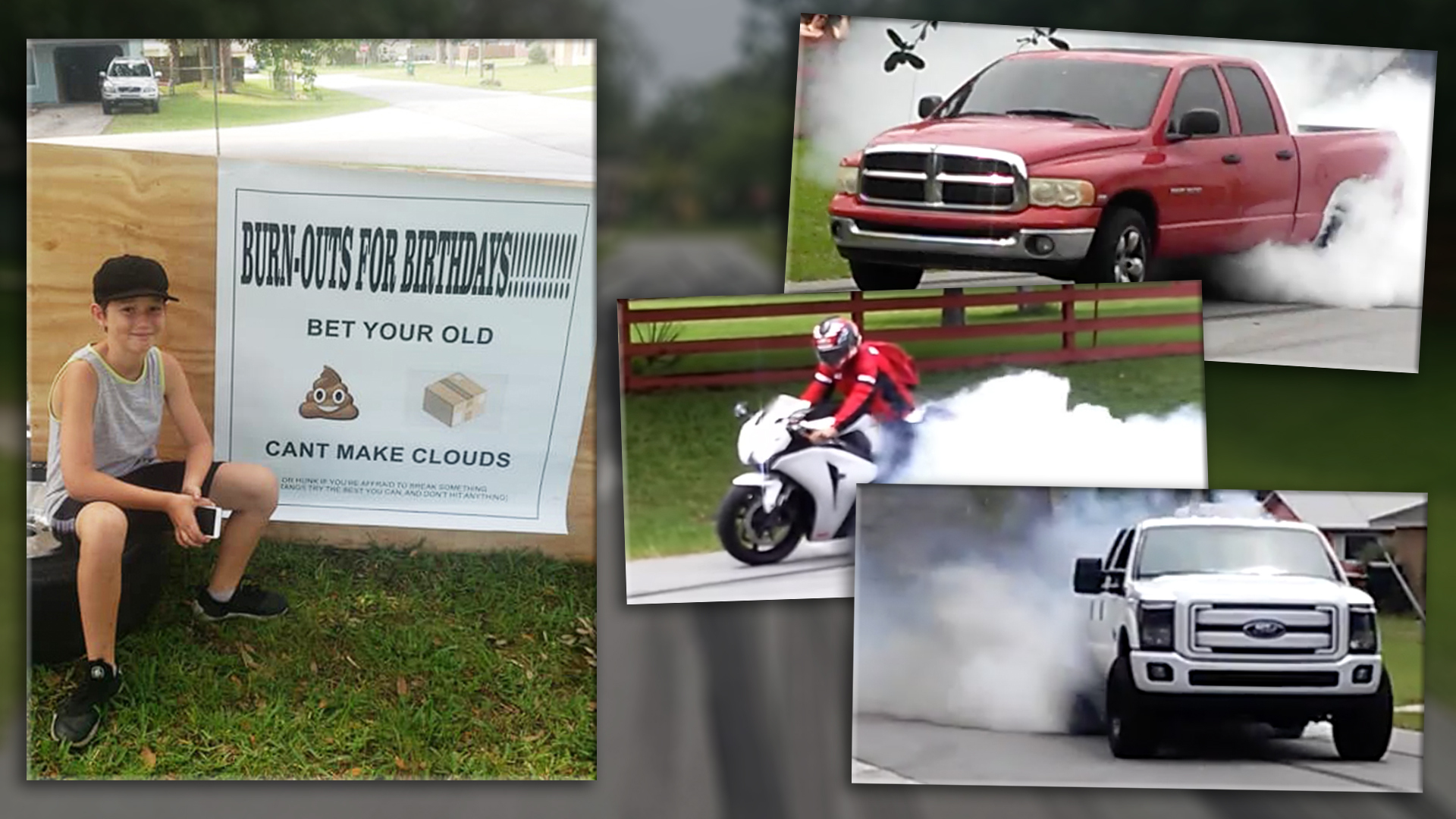 What’s the best birthday party you remember having as a kid? Did it have a bounce house? Zoo animals? Regardless, it probably didn’t have a bunch of strangers cranking burnouts in front of your house. Your birthdays may have been cool, but they’ve got nothing on this kid’s idea. A 13-year-old Florida boy and his family set up a trap for anyone driving through their neighborhood by making a “Burn-Outs For Birthdays” sign, issuing the challenge: “Bet your old shitbox can’t make clouds.”