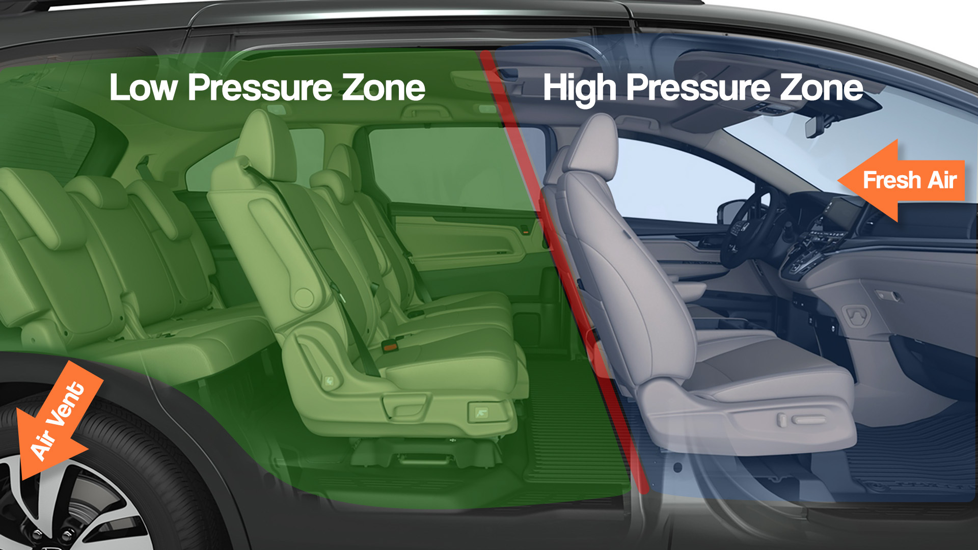 While designing the prototype minivan, engineers installed a clear polycarbonate panel between the front and center seating rows, attached with custom fabricated brackets. But, they then decided that a physical barrier wasn’t enough to keep the drivers of the vehicles safe. So the van’s HVAC software was modified to include special airflow zones throughout the cabin, separating the front seats of the van in a pressurized compartment and exhausting the cabin air through the vehicle’s rear vents. This effectively creates a front-to-back current and prevents the backflow of droplet contaminants to the driver and front-seat passenger.