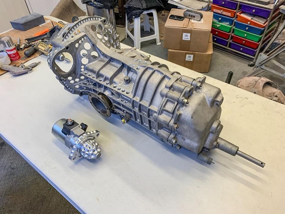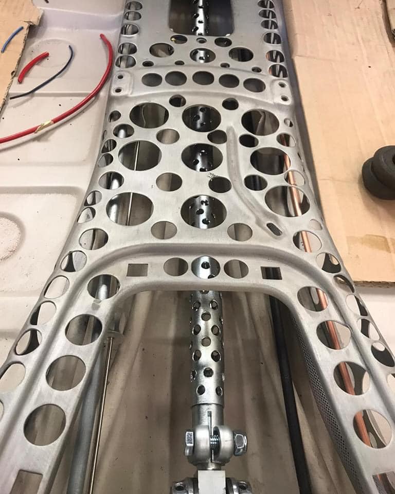 Fortunately, King is welding some tabs back in certain areas to shore up the structural rigidity of what’s left. When adding holes wasn’t possible, King still used as many lightweight components as possible. The beautiful backdated exterior bodywork is all fiberglass. Hoses and other components were weighed and swapped out for lighter weight versions. There’s even a custom aluminum mount for the engine.
