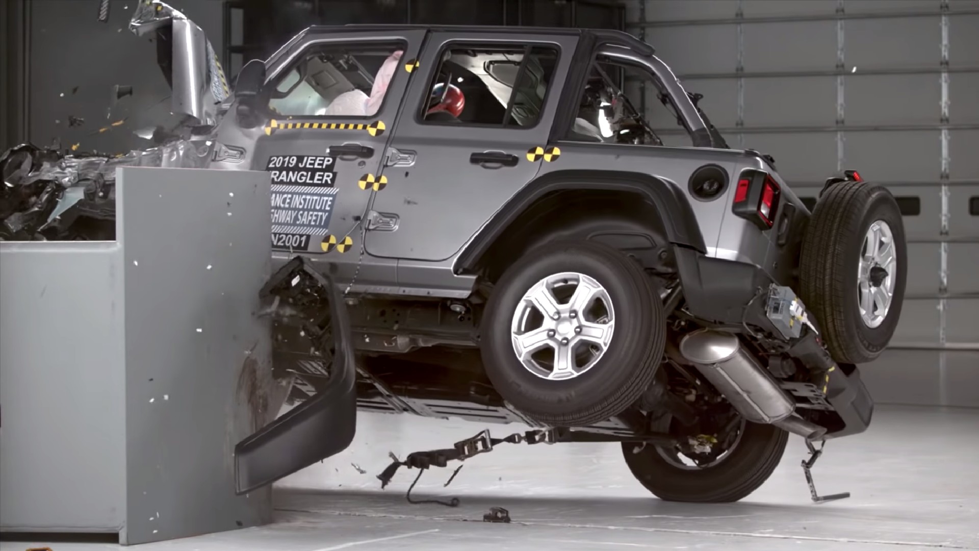 The current-gen Jeep Wrangler scored less-than-ideal marks from the Insurance Institute for Highway Safety (IIHS) after it violently flipped on its side during a pair of front-impact crash tests. In both tests conducted by the IIHS, the convertible off-roader landed on its passenger side after striking the crash barrier, earning it an overall rating of marginal from the agency.