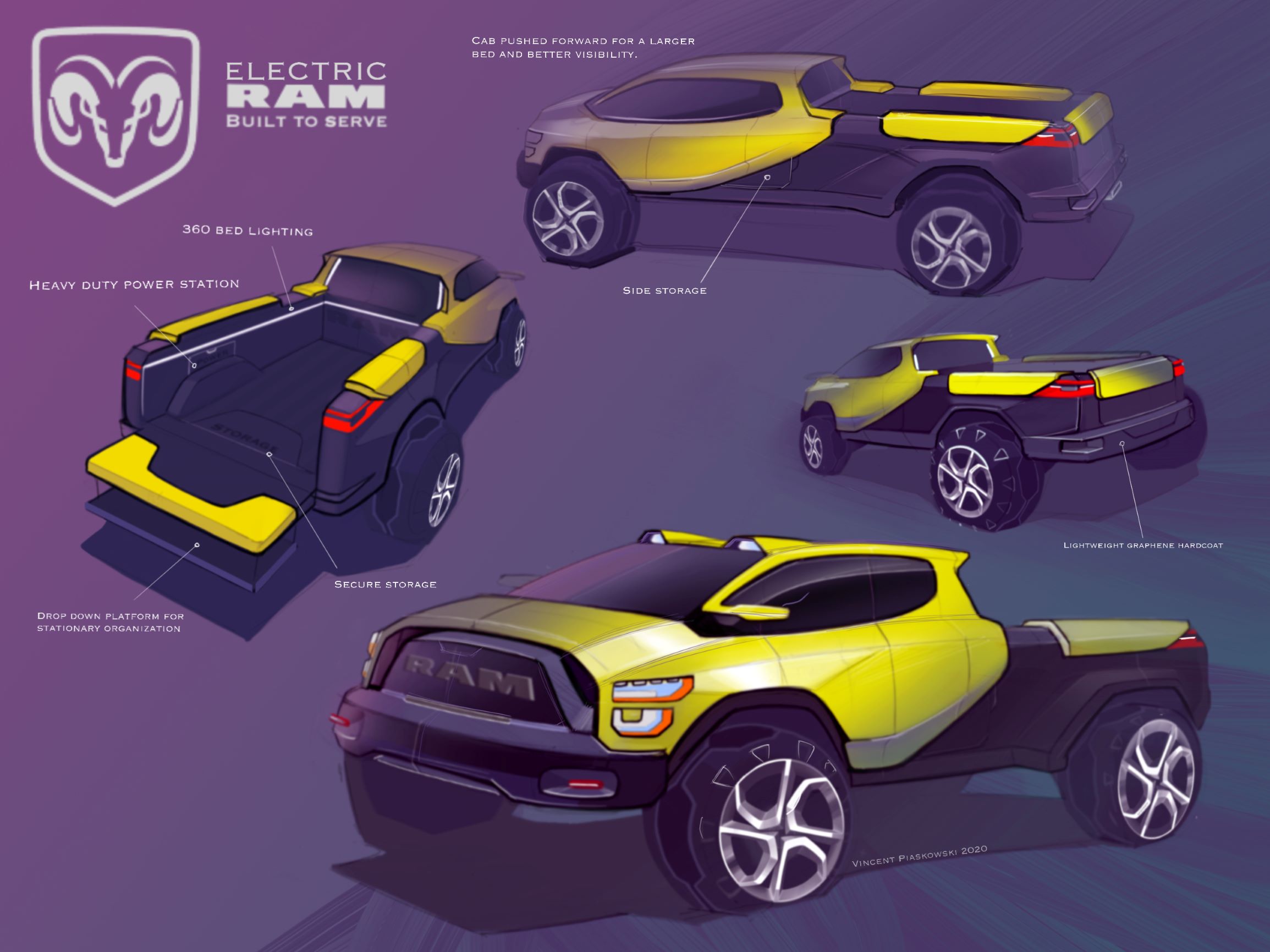Coming in second is Vincent Piaskowski, an 11th grader from Birmingham, Michigan with an electric Ram. Without the need for a big gas engine up front, Piaskowski has cleverly pushed his cab forward for a much bigger bed and better visibility. It’s a cool design that kinda resembles what a future Toyota Tundra may look like what with its two-tone exterior (Toyota likes to do that these days) and small, off-to-the-corner headlights.