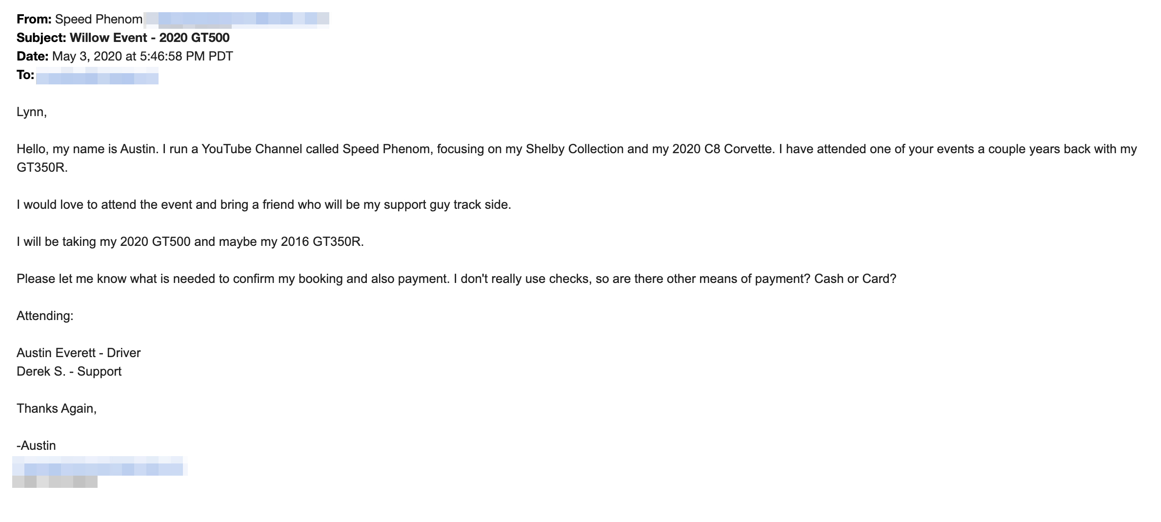 “I would love to attend the event and bring a friend who will be my support guy track side. I will be taking my 2020 GT500 and maybe my 2016 GT350R,” the email reads. Nowhere does he say that he’d bring the Corvette.