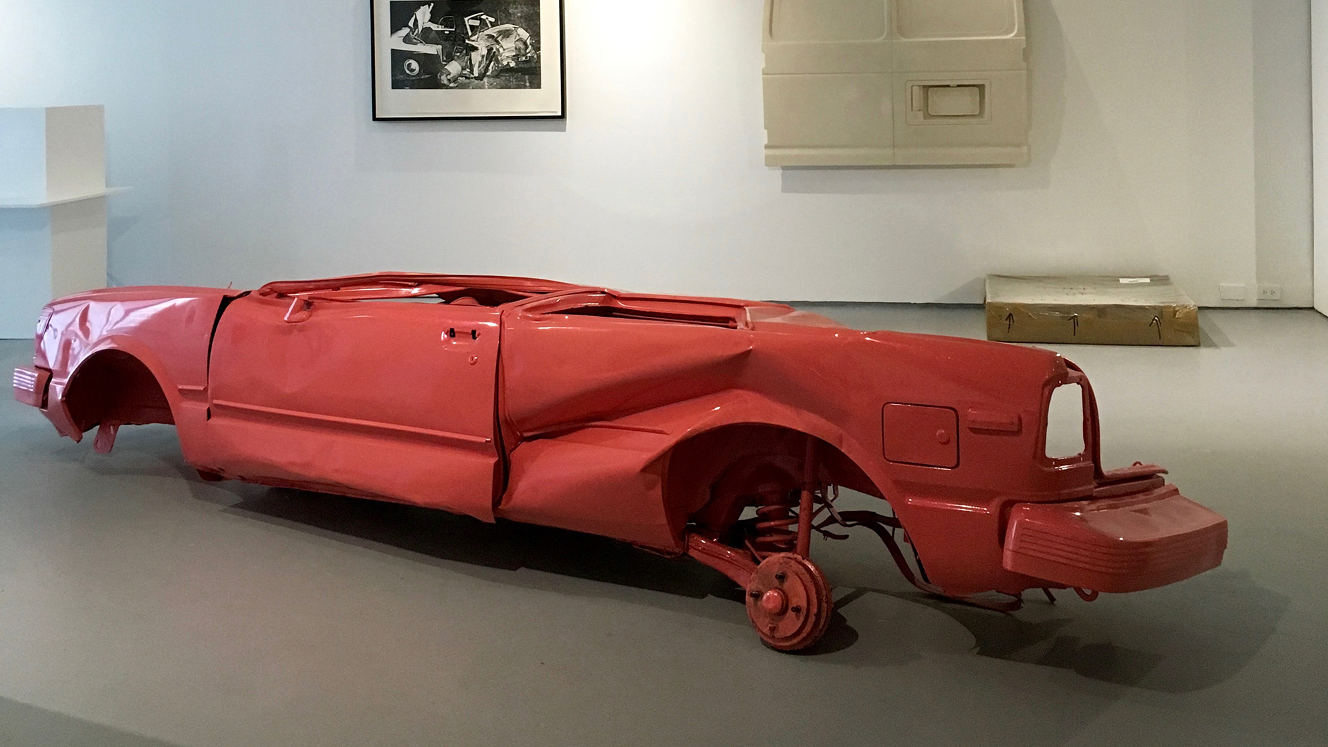 “On the west coast, the connection to the car is dictated by the landscape, and by the fact that you need a car,” Brodie says. The output from artists from the region are therefore often more visceral, and literal. “East coast artists often refer to the car more obliquely,” she says, pointing to a giant, silkscreen cutout of a Little Trees air freshener from Nate Lowman.