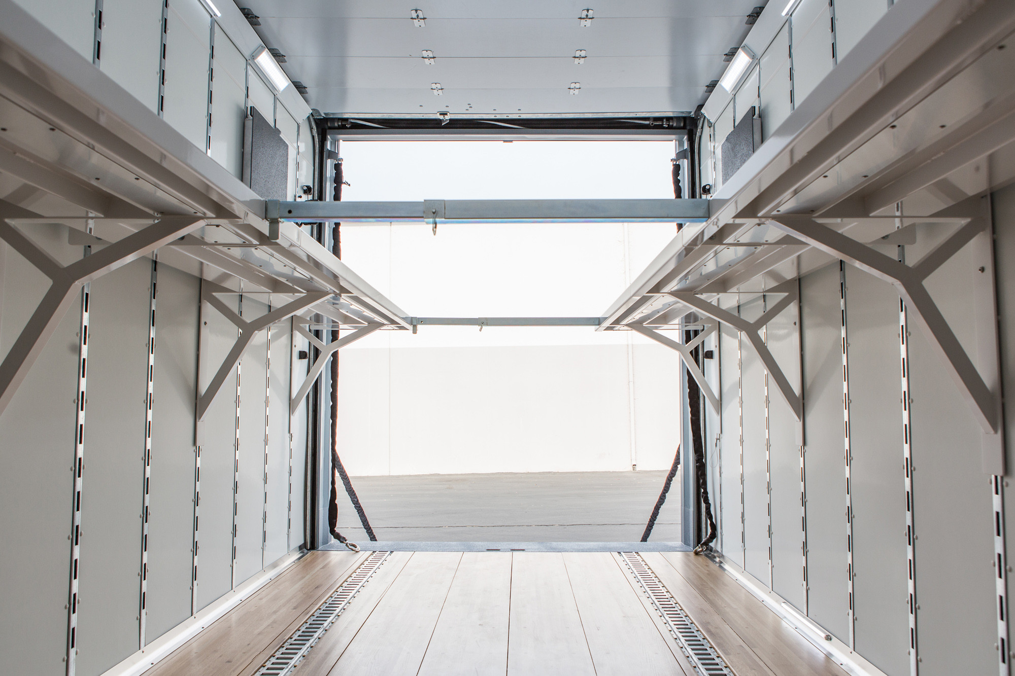 Inside the trailer, you’ll find an exceptionally versatile layout that’s meant to hold a maximum of four cars. Of course, that’s not all there’s room for. The parking decks are height-adjustable, making way for vehicles of all shapes and sizes. Then, hidden away is a secluded, zippable lounge area that’s key for decompressing during a busy race weekend. Every room in the trailer has hardwood flooring and vibrant lighting, making it look more like a top-notch showroom than a weekend beater.