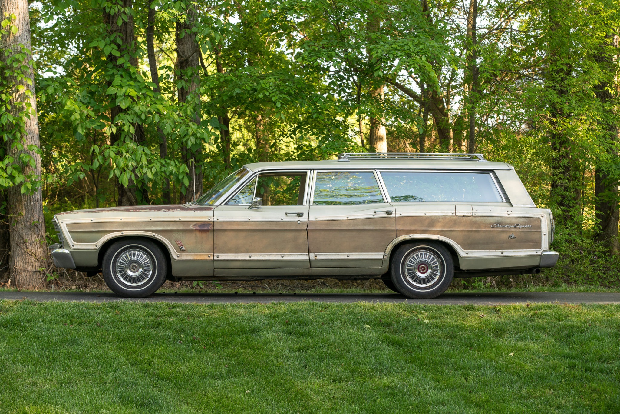 The exterior is finished in Sauterne Gold with—what else—woodgrain applique. Hard-earned patina has tinted the paint and given it a proper look to match its thumping powertrain all the while. As for the cabin, it’s in impressive condition give its originality.