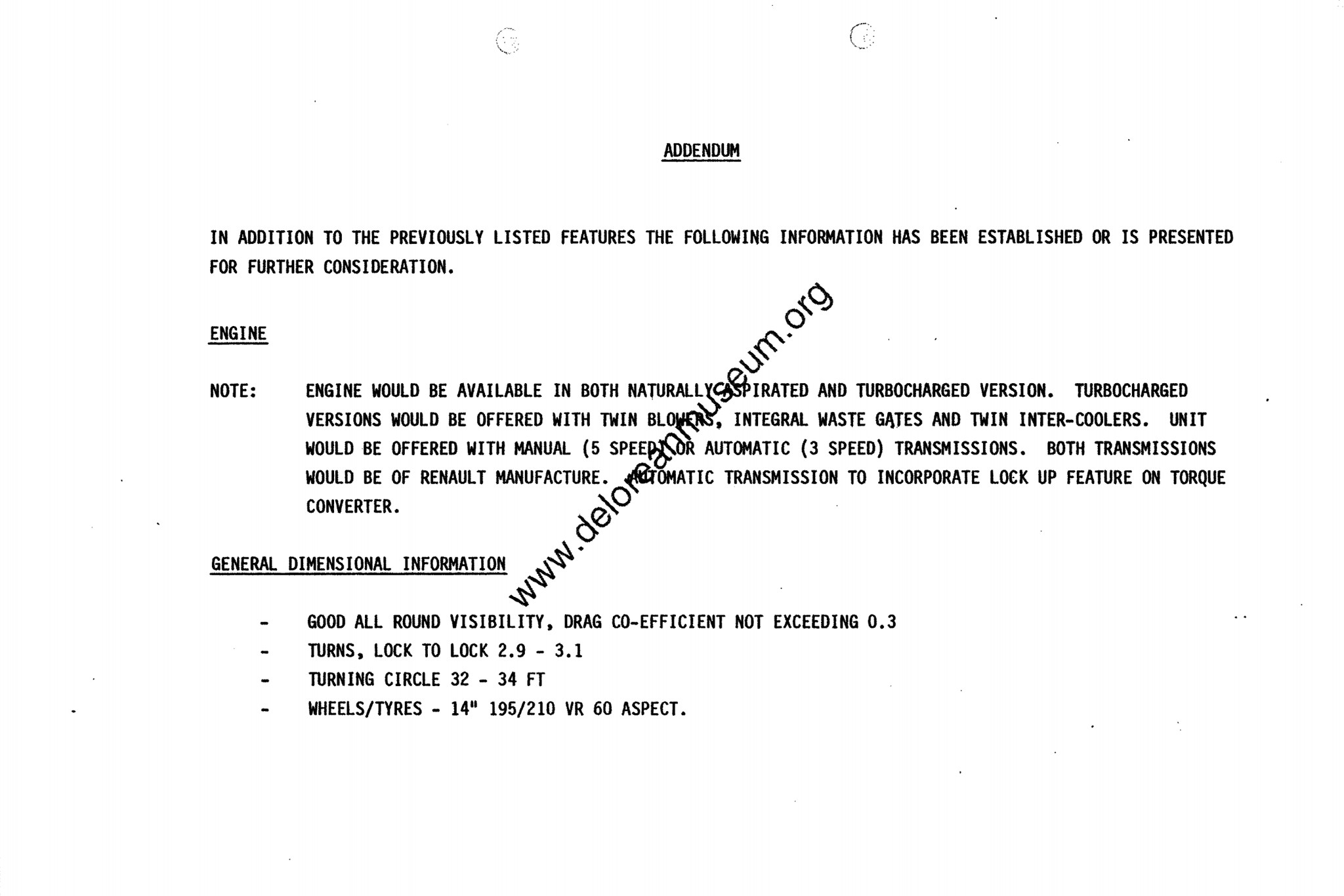 OK, so maybe they didn’t have everything nailed down. The powertrain, though—that was the easy part. The 2.85-liter Renault V6 from the DMC-12 would be upgraded with twin turbochargers, both with integral wastegates. That hot charge of air would then be sent through two intercoolers before reaching the combustion chamber. It is also stated that the engine would be offered with natural aspiration and a choice of a 5-speed manual or 3-speed automatic transmission. This turbocharged power would be a step in the right direction for the brand—the DMC-12 was known for being far slower than it looked, having just 130 horsepower.