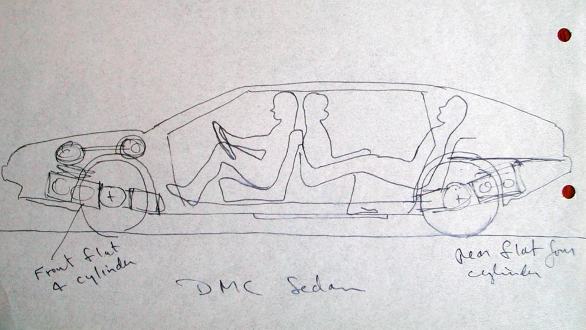 An appropriately convoluted tale for an automaker as weird as DeLorean. Anyway, let’s get back to these early sketches from the late 1970s, because they show DeLorean’s plans in their truest, most unadulterated form—starting with a three-row, twin-engine sedan molded in the DMC-12’s iconic wedge shape. And of course it had gullwing doors. See for yourself: