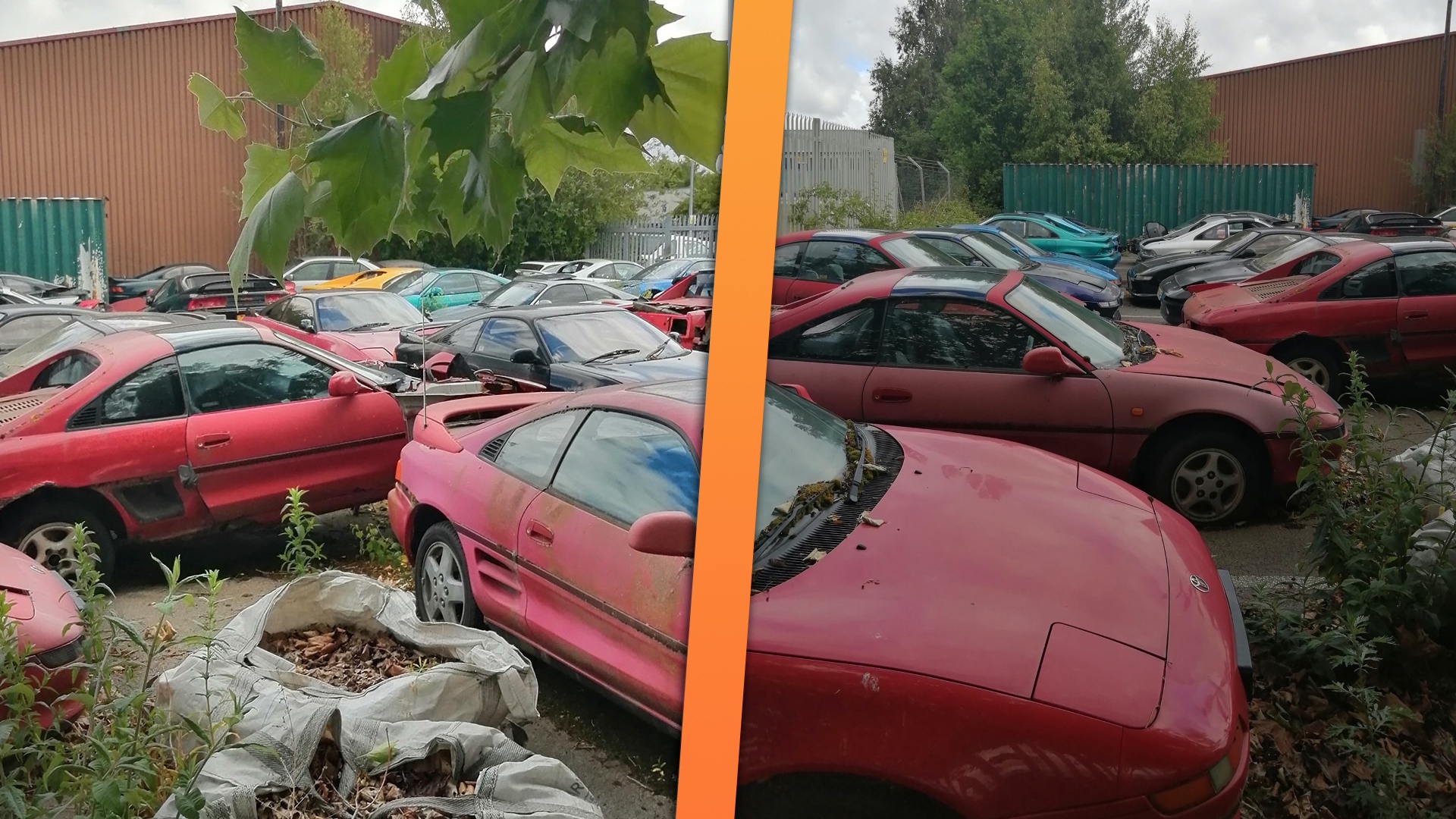 Photographed by Keith Browne and uploaded to Facebook, the fenced-in lot you see here is filled to the brim with neglected MR2s. Most are the popular second-generation “SW20” model, though at least one of the wedge-shaped “AW11” models from the ’80s is also visible. The majority are naturally aspirated cars, not the sought-after forced induction models, though raised engine deck vents identify at least one of the curvaceous second-gen cars as an early 232-horsepower Turbo model.