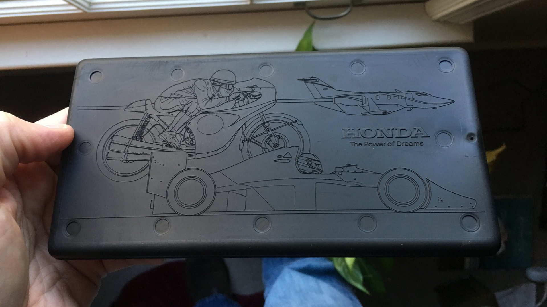 At the bottom of the center console is a mat—you know, that small piece of rubber that makes it easy to clean all of the dust and crumbs from the tiny compartment? Turn that over and in many cars, you’ll find a plethora of retro racers, motorcycles, planes, and tech that reminds you of Honda’s gigantic footprint.
