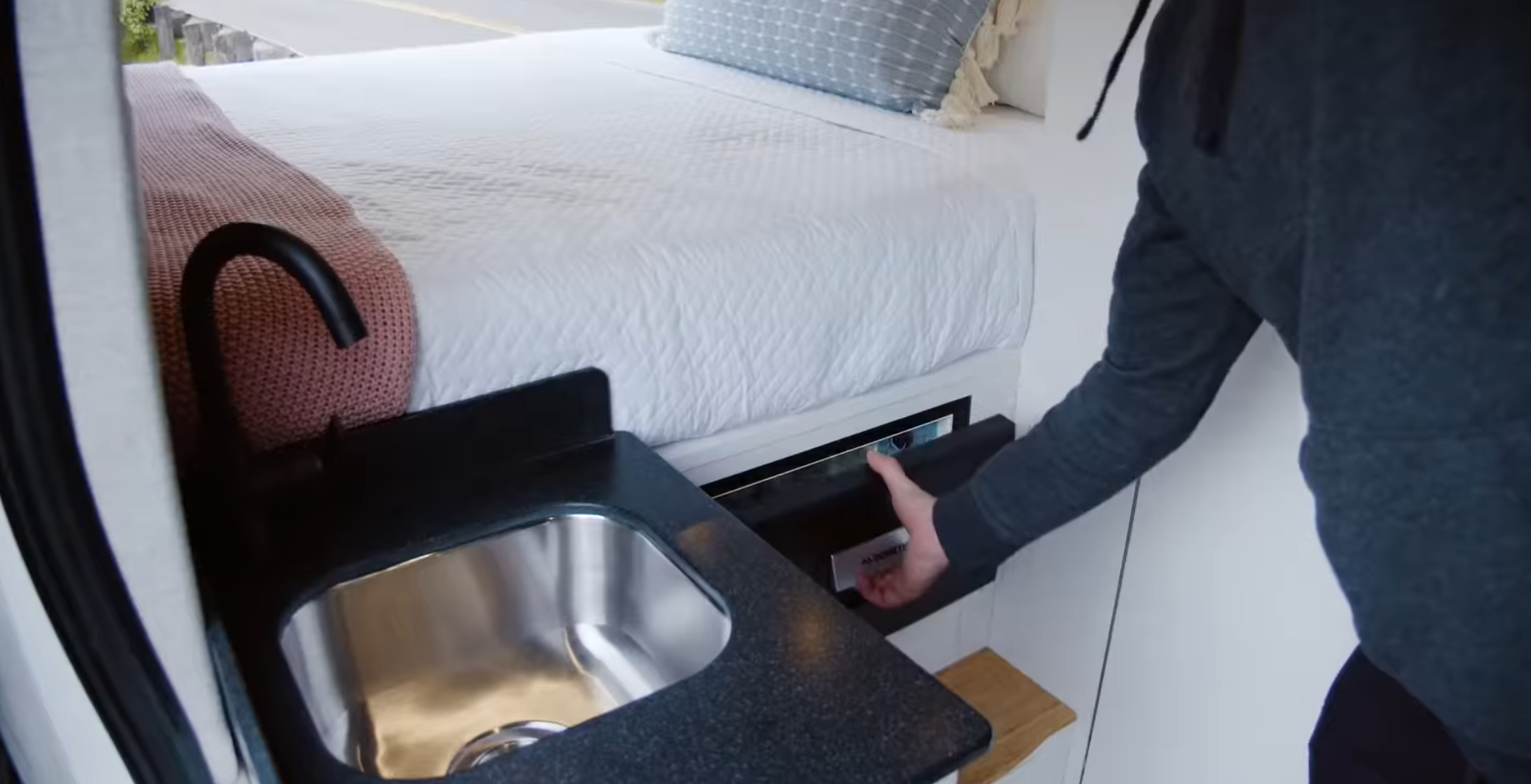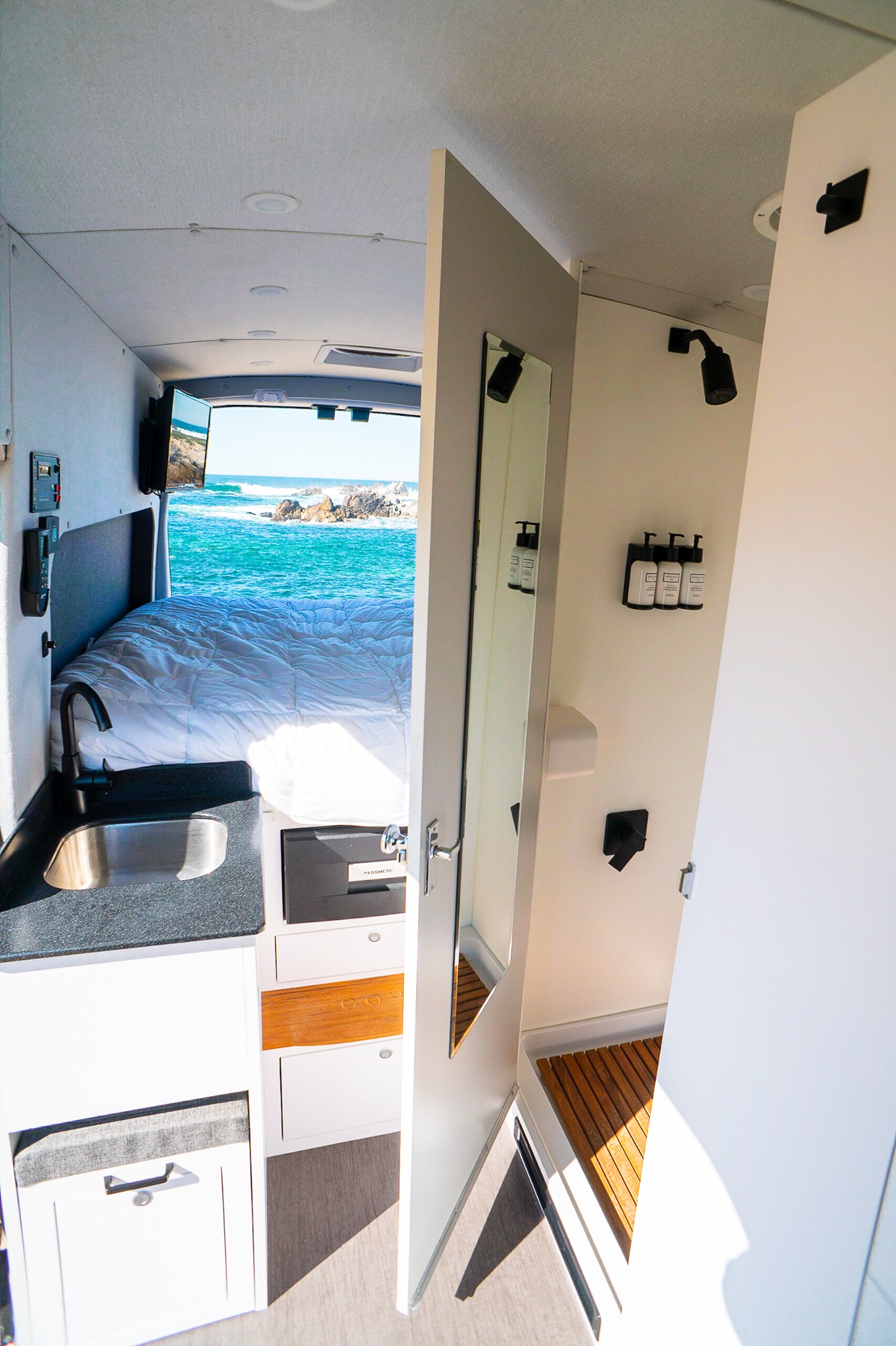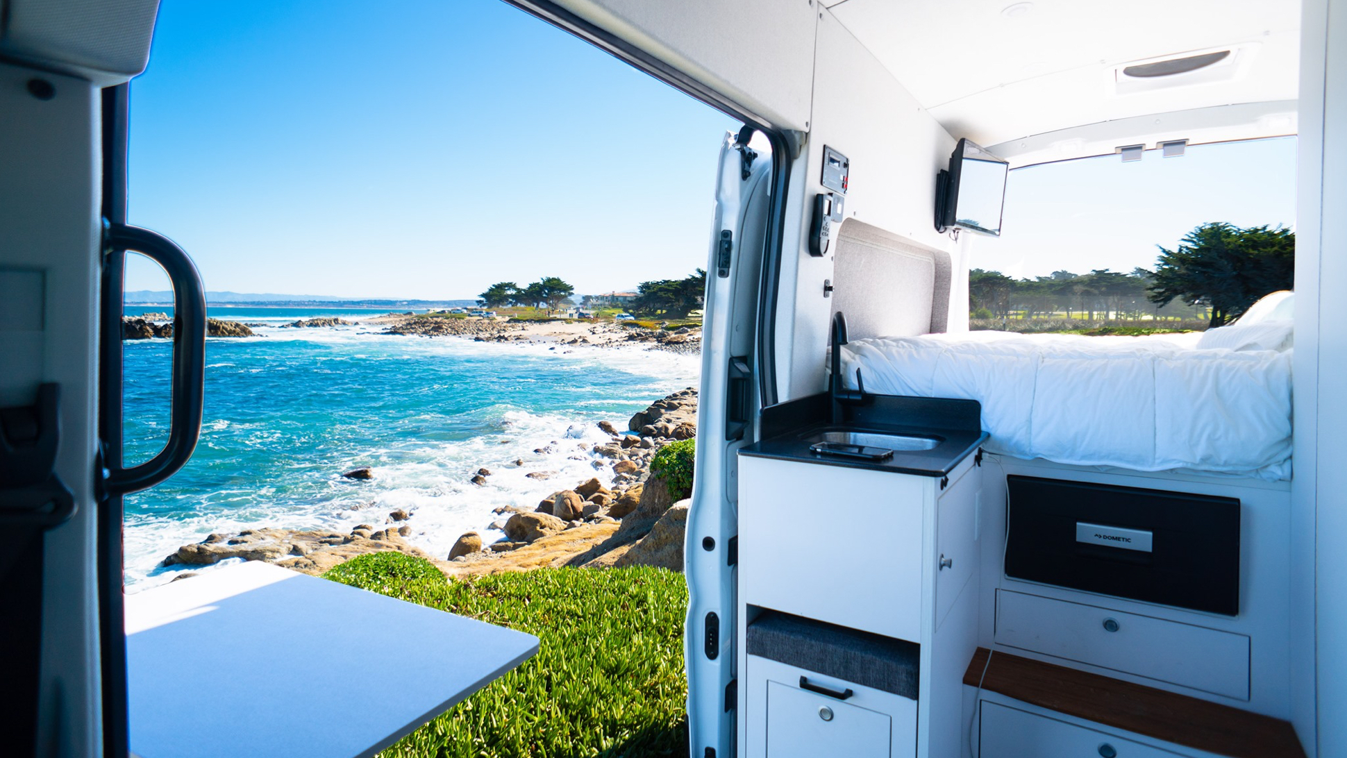 Each van is off-grid-ready with its own power and water systems, complete with a 45-gallon fresh water tank, 200-watt solar panels, and batteries that will last up to 18 hours on their own. Every van features a queen bed, stowable table, storage, a 24-inch TV, wifi, a bathroom with a five-gallon toilet and shower, an exterior shower, and an indoor kitchen with a sink and a refrigerator. Cabana provides essentials like camp chairs, cleaning wipes, toilet paper, shampoo, bedding, and even coffee pods, too. Some vans also offer pop-up tents and slide-outs to give the kitchen more room.