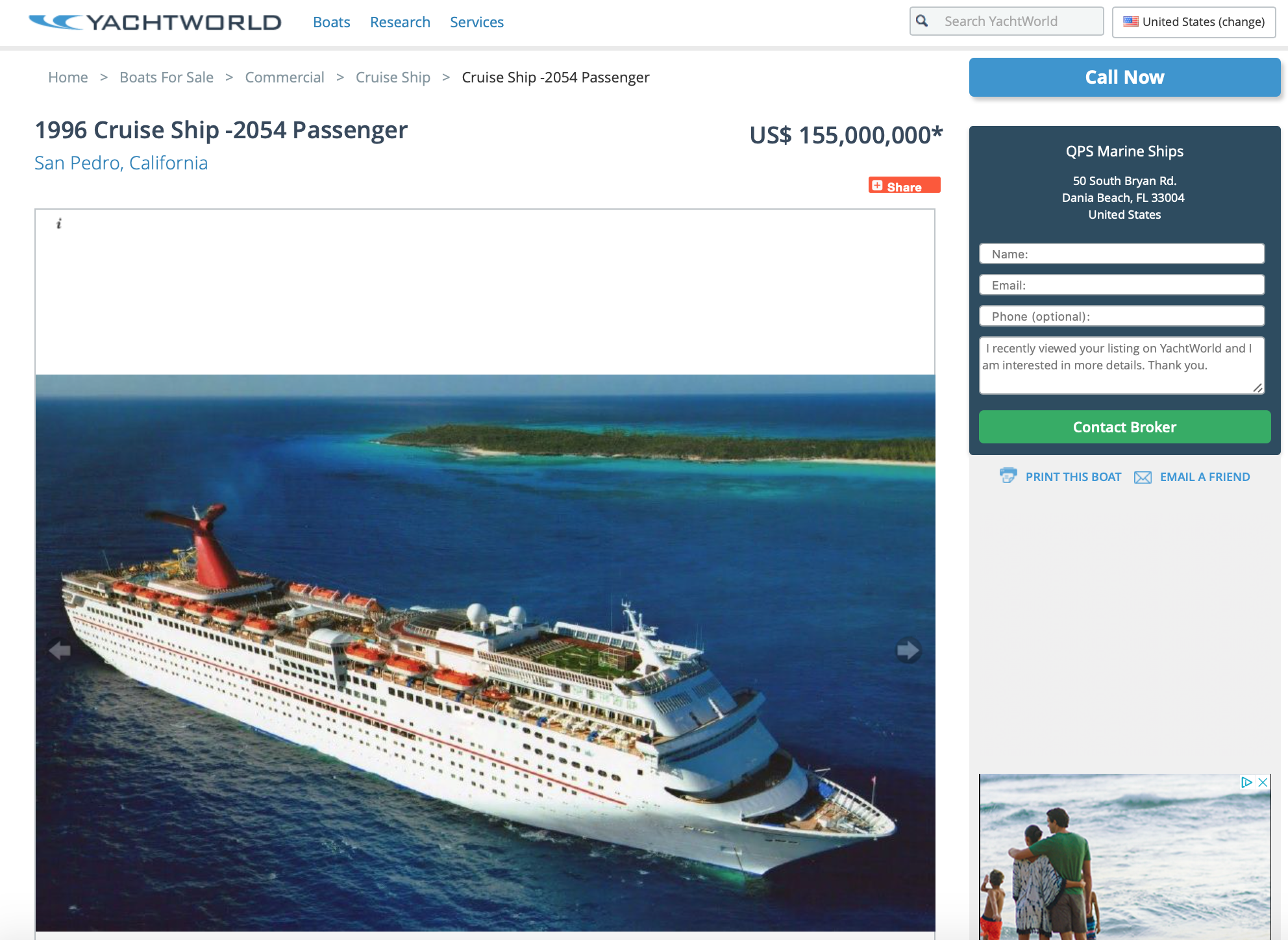 Listed for sale on Yacht World for a not-insignificant amount, is this 1996 “Cruise Ship” which looks to be a former member of the Carnival fleet. But first, do cruise ships not have make and models? If that’s the case, I think they should, and they should all be named after characters from The Little Mermaid or Finding Nemo. How cool would it be to buy a 1999 Sebastian or a 2006 Dory? Regardless, you’re going to need some serious coin or a very well-executed GoFund Me campaign, because the selling price on this bad boy is an iceberg-shattering $155,000,000. Yes, that’s $155 million American Greenbacks.