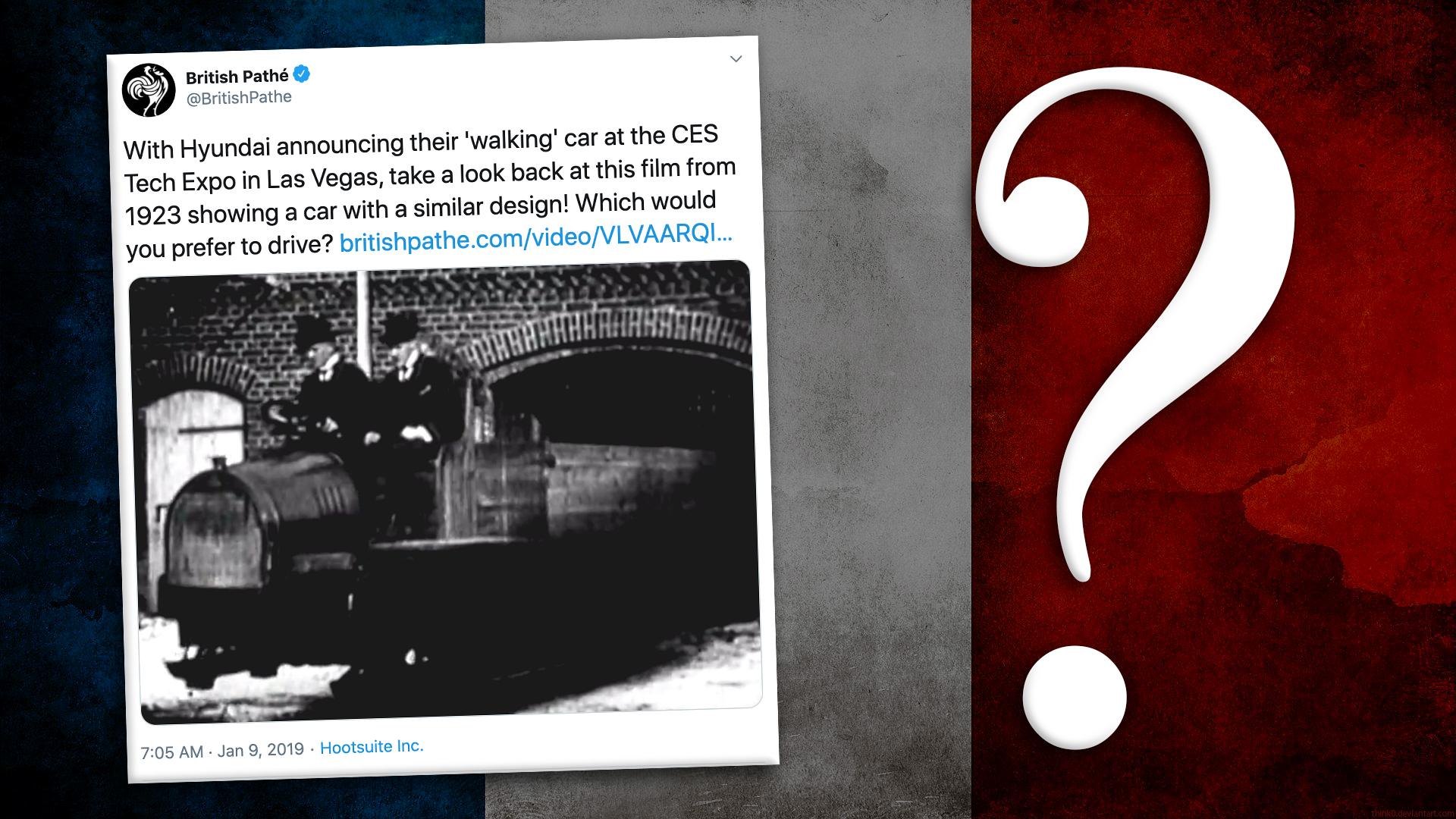 Video Roll Title: A French inventor’s new ‘walking’ car – useful for getting over difficulties: 43ft Issue sheet title: MIND YOUR STEP! A FRENCH INVENTOR’S NEW ‘WALKING’ CAR – USEFUL FOR GETTING OVER DIFFICULTIES.