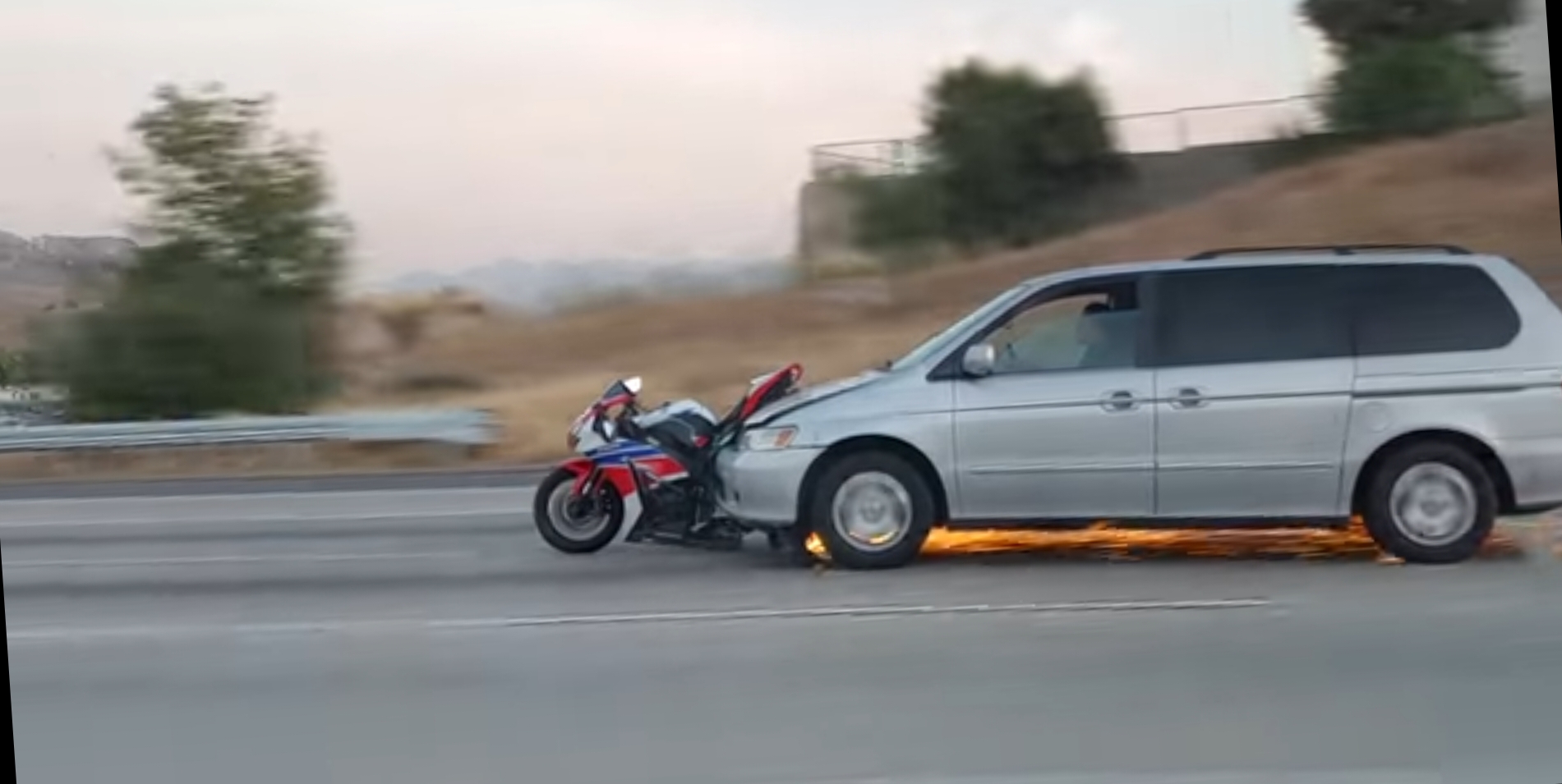A motorcyclist escaped with just minor injuries after a crash where a minivan effectively wore his bike as a hood ornament down State Route 91 in Corona, California, on June 19. CBS Local reported the driver of the minivan was fleeing the scene after a hit-and-run wreck and was later charged with a felony.