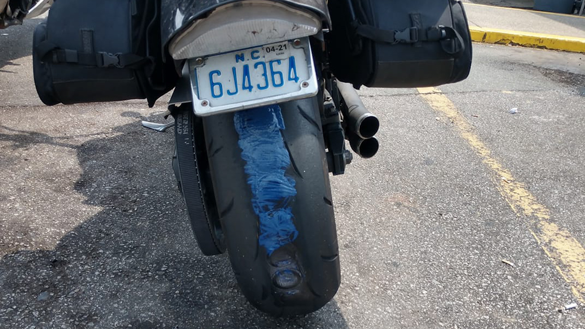 It’s not uncommon to spot crazy—and often stupid—antics on the Tail of the Dragon. Eddie Molesky doesn’t fit into that category per se, though he was forced to make an impromptu repair on his bike when he visited the famous road over the fourth of July weekend. Shortly put, it involves a worn tire, a lot of rubber cement, and heaping spoonfuls of determination, for better worse.