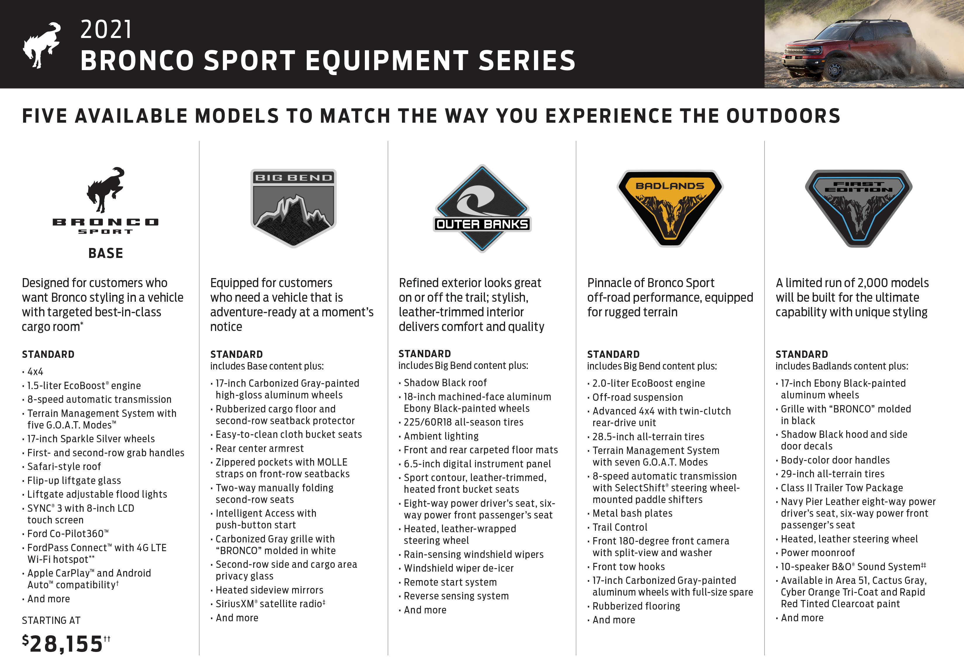 Like the larger Broncos, reservations for the Bronco Sport open the second the public reveal wraps up, and it can be secured for a $100 deposit against the $28,155 starting price. The 2021 Ford Bronco Sport will arrive at dealers by the end of 2020, by which time we’ll surely know if the Bronco Sport can show up the Jeep Trailhawks like Ford intends.