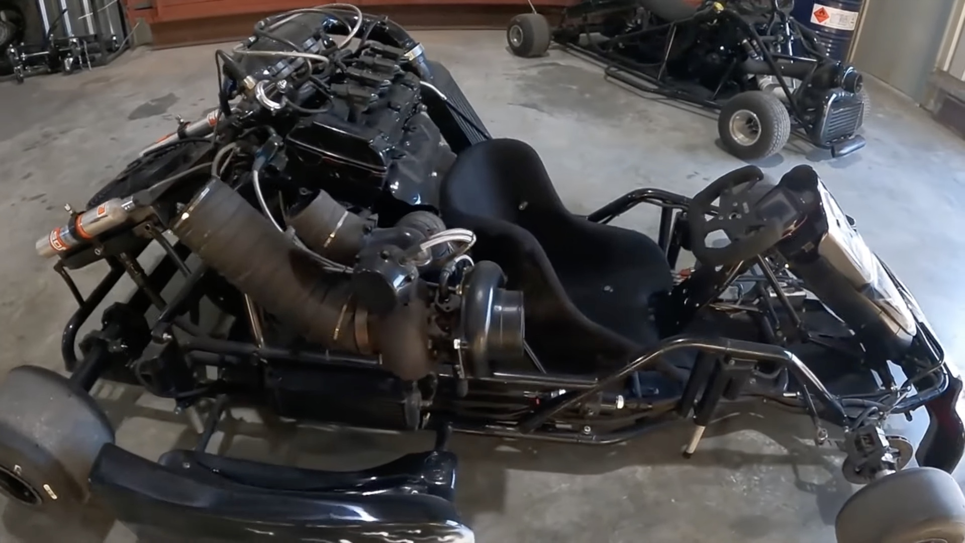The clip’s title touts the machine’s 400 hp output, but Robertson admitted in another video uploaded in February that he never turned it up past 350. A little bench racing never hurt anyone, though. Soon, he says that 400 hp figure will be old news anyway. The plan is to take the kart above and beyond with the help of a second turbo to generate a targeted 800 hp. That’ll give it the power-to-weight ratio of a thermonuclear weapon and make it almost as dangerous, too. This will require a compound turbo setup, meaning the smaller of the two compressors directly boosts the larger instead of feeding the intake. It’ll have dual intercoolers, one just to cool the charge from the smaller turbo to avoid overheating the bigger one.
