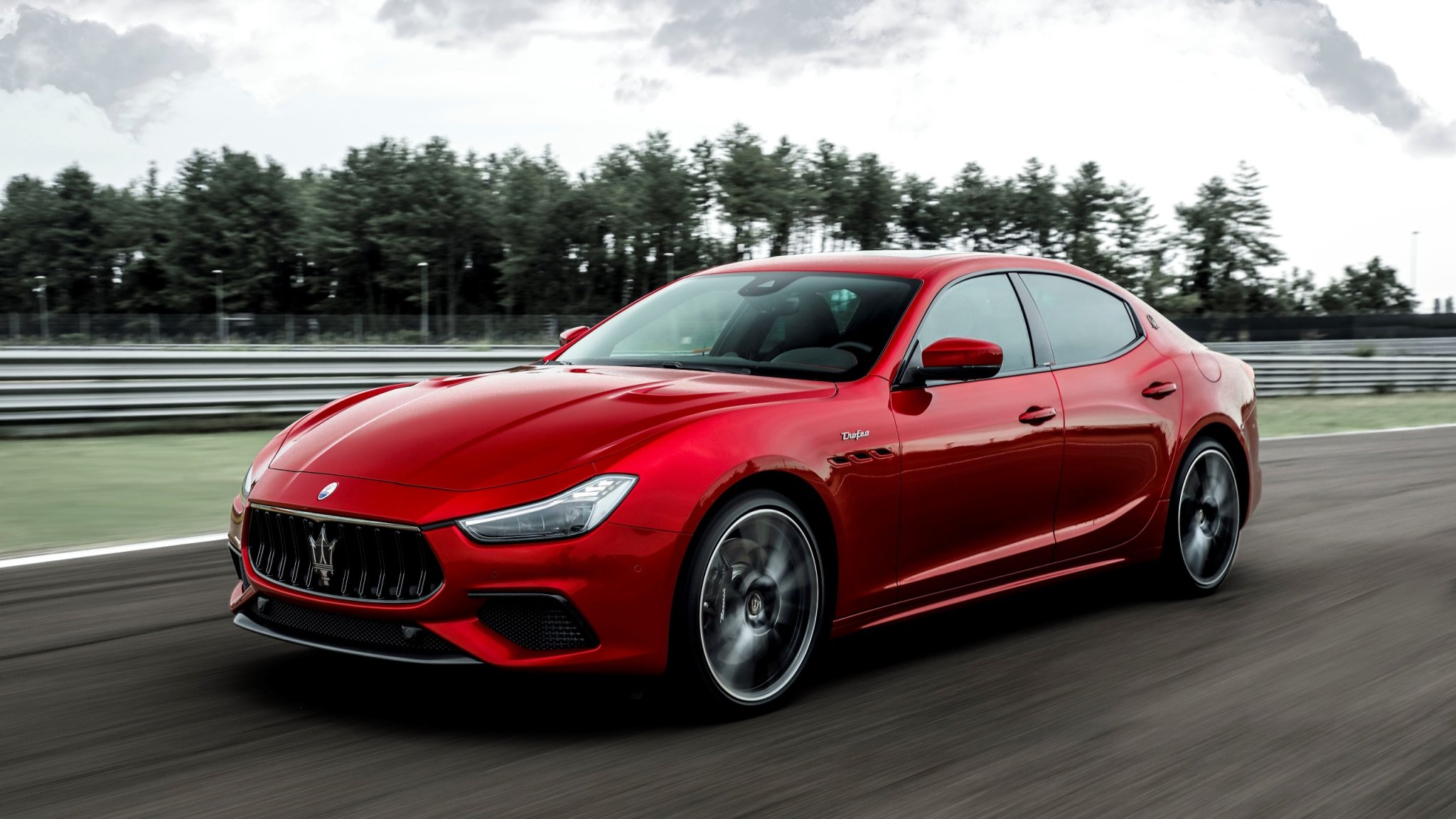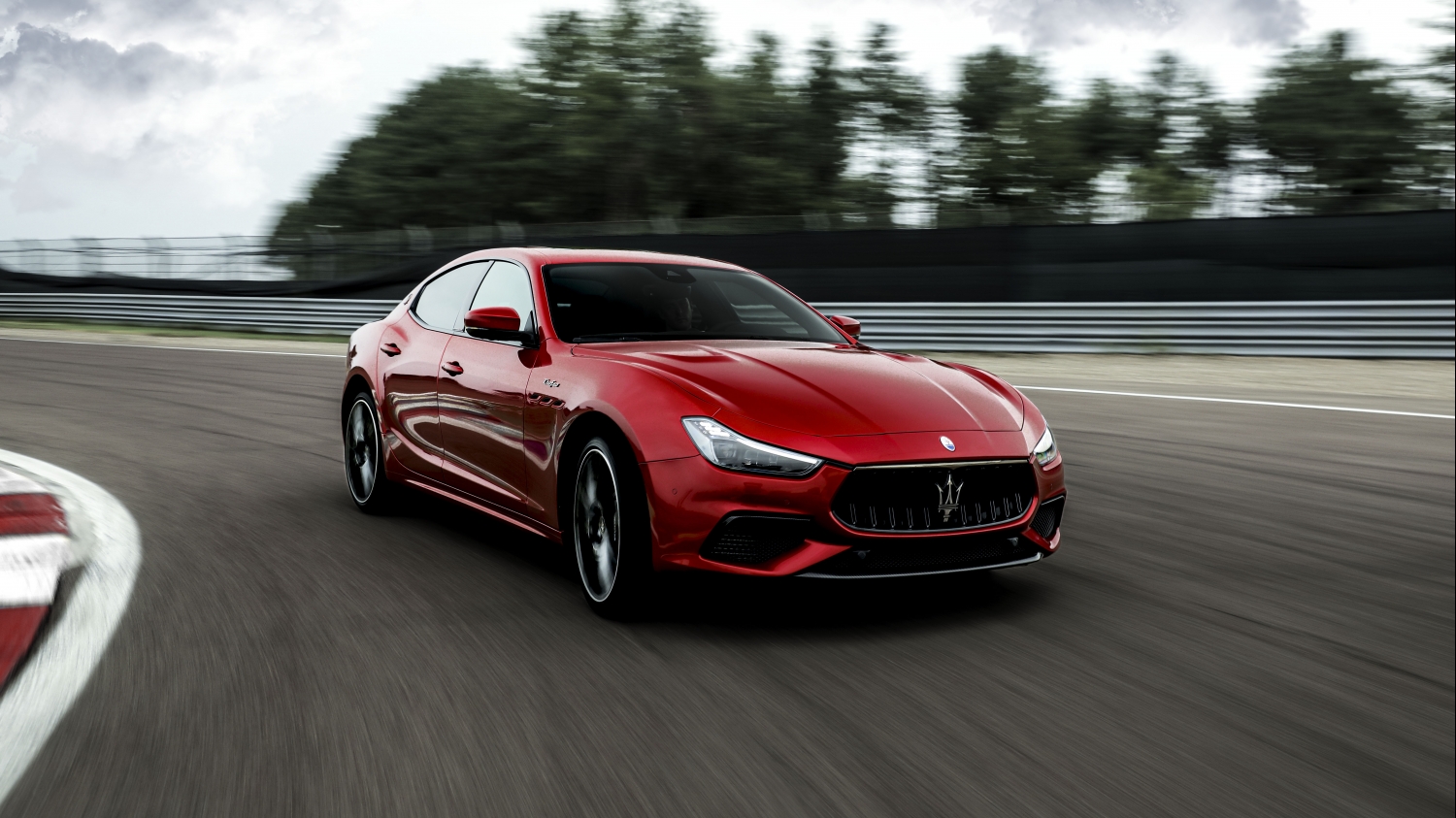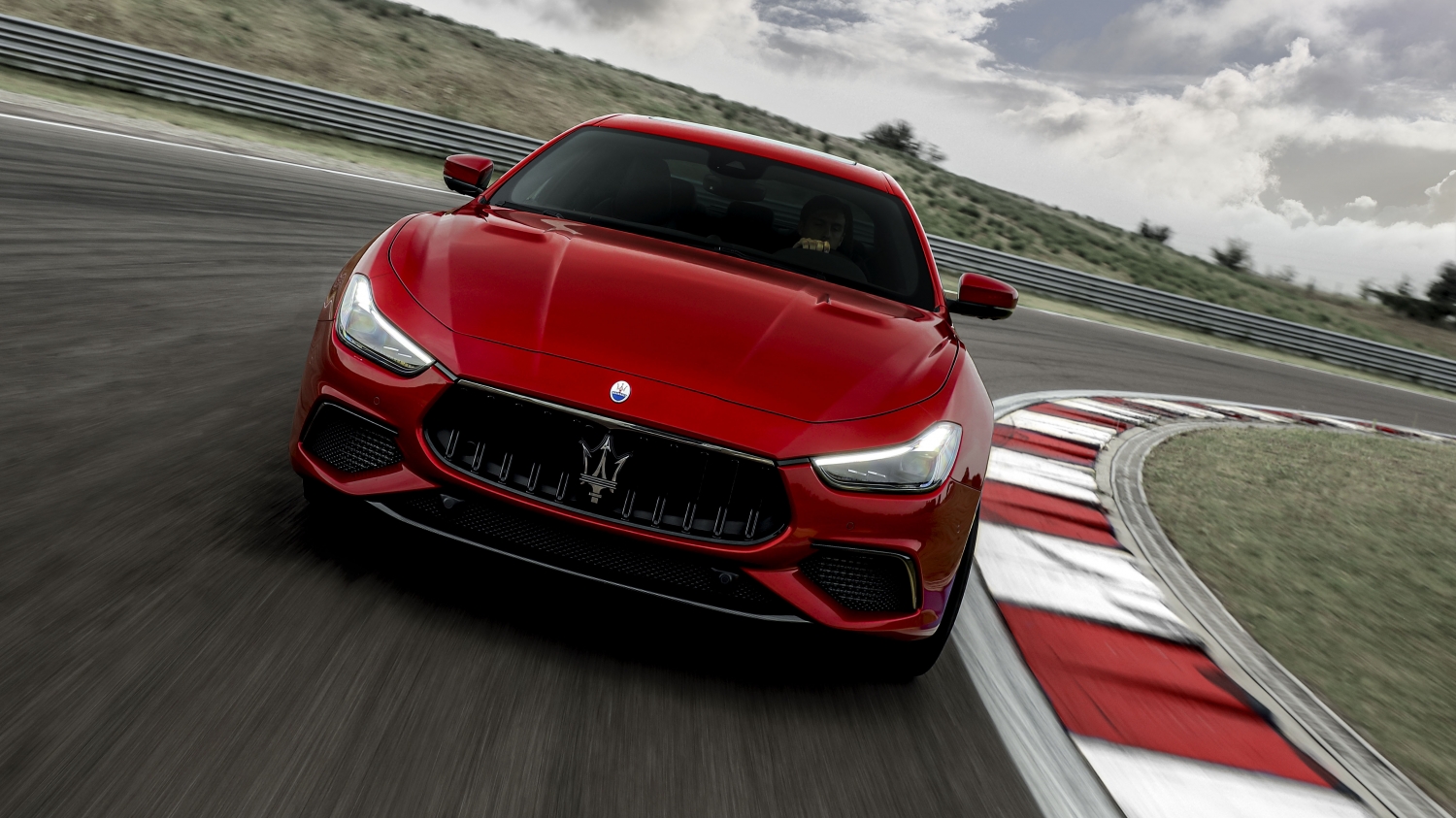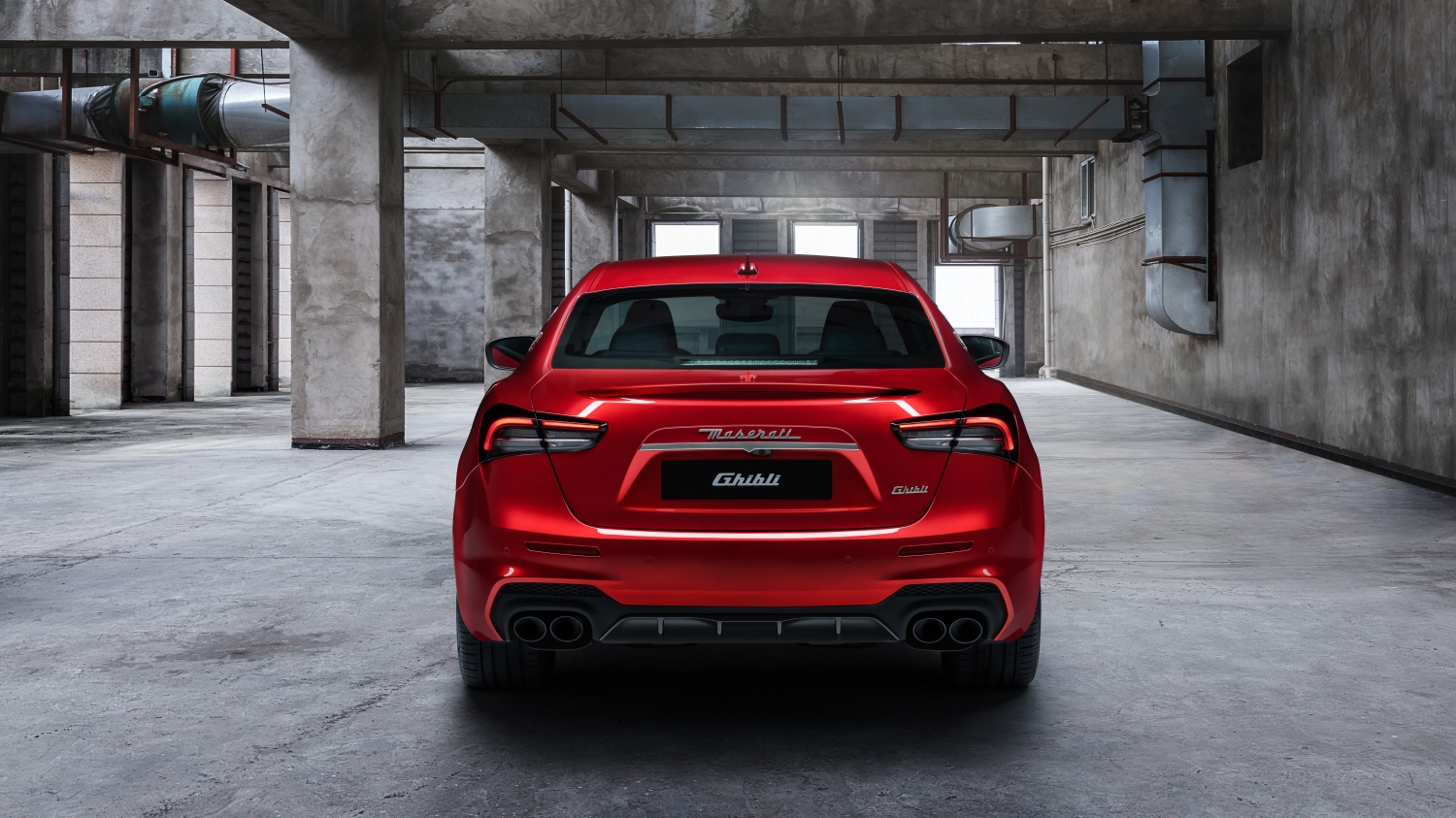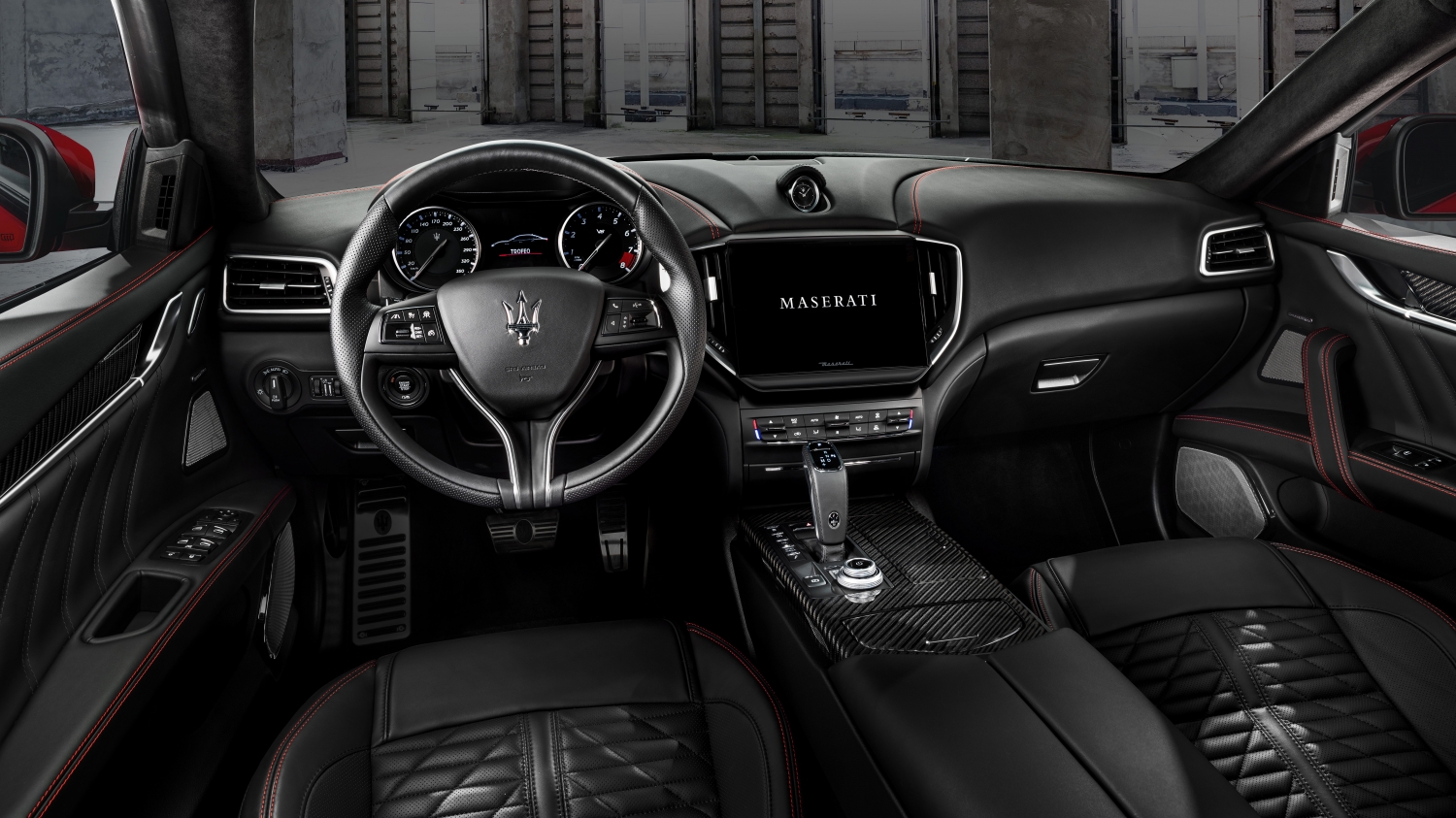 Visually, the Trofeo twins make themselves known via gloss black vertical grille bars, carbon aero trim front and rear, and red trim on the side air vents. The Ghibli Trofeo gets a new, vented hood while both get new taillights.