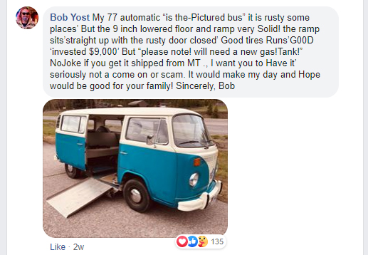 The post in the VVWCA group gained a bit of traction with people offering advice on the conversion and offered some leads on who to contact for more information. However, something even more incredible happened shortly thereafter, when the owner of the bus that Kusak posted a photo of, Bob Yost, popped up in the comments and offered to give him the very same vehicle as a gift—no charge.
