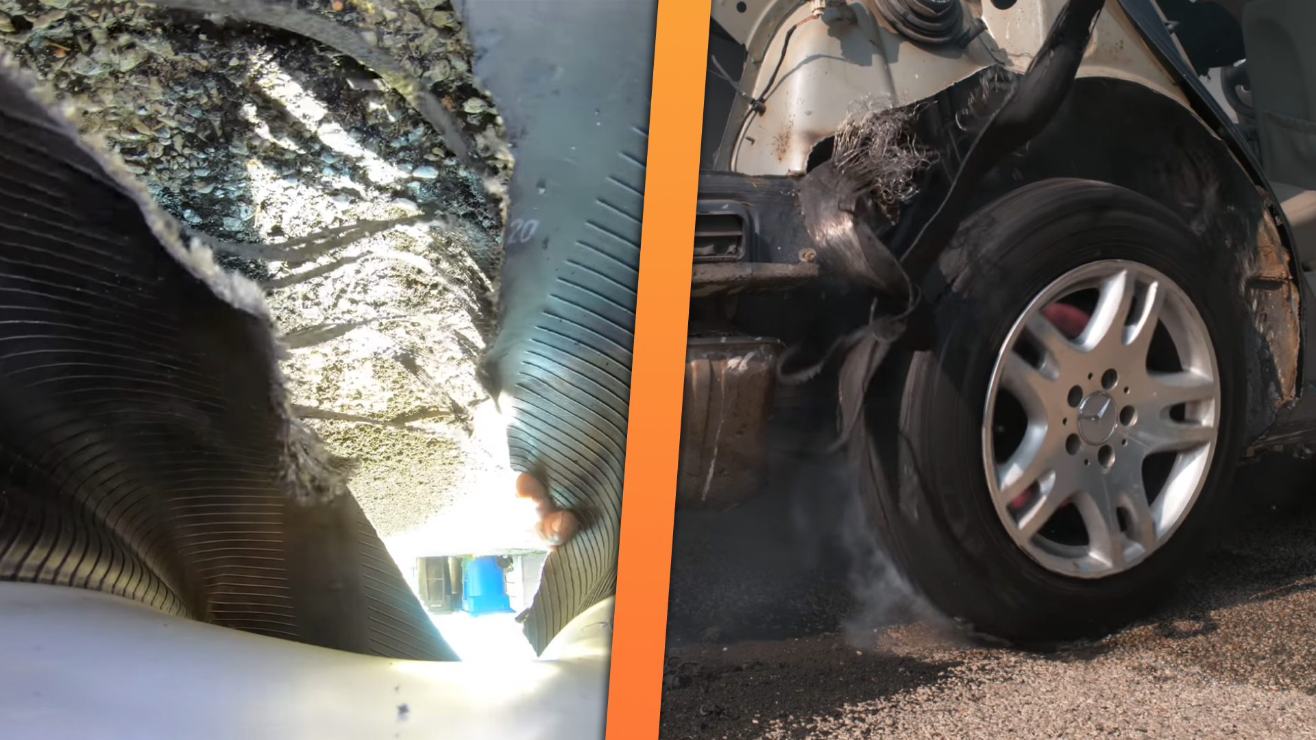 To satisfy multiple viewers’ requests (including ours) and find out, Warped Perception mounted yet another GoPro to a wheel and then mounted a tire around it. This time, the test car has no body panels at all. It’s just the responsible thing to do when you know a tire is going to blow up and you don’t want to damage your nicer car. Better yet, it gives us a clear look at the massive cloud of smoke they create for this test and the belts that whip around as the tire gets destroyed.