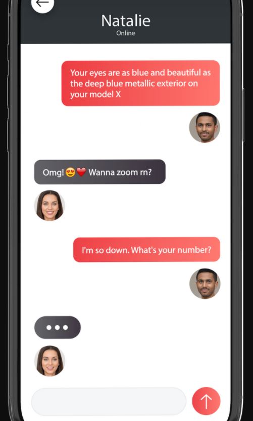 As delicious as this cake of hilarious obnoxiousness might already be, the real laughs come in the form of Tesla Dating’s sample screenshots, such as this ultra-realistic exchange with “Natalie.”