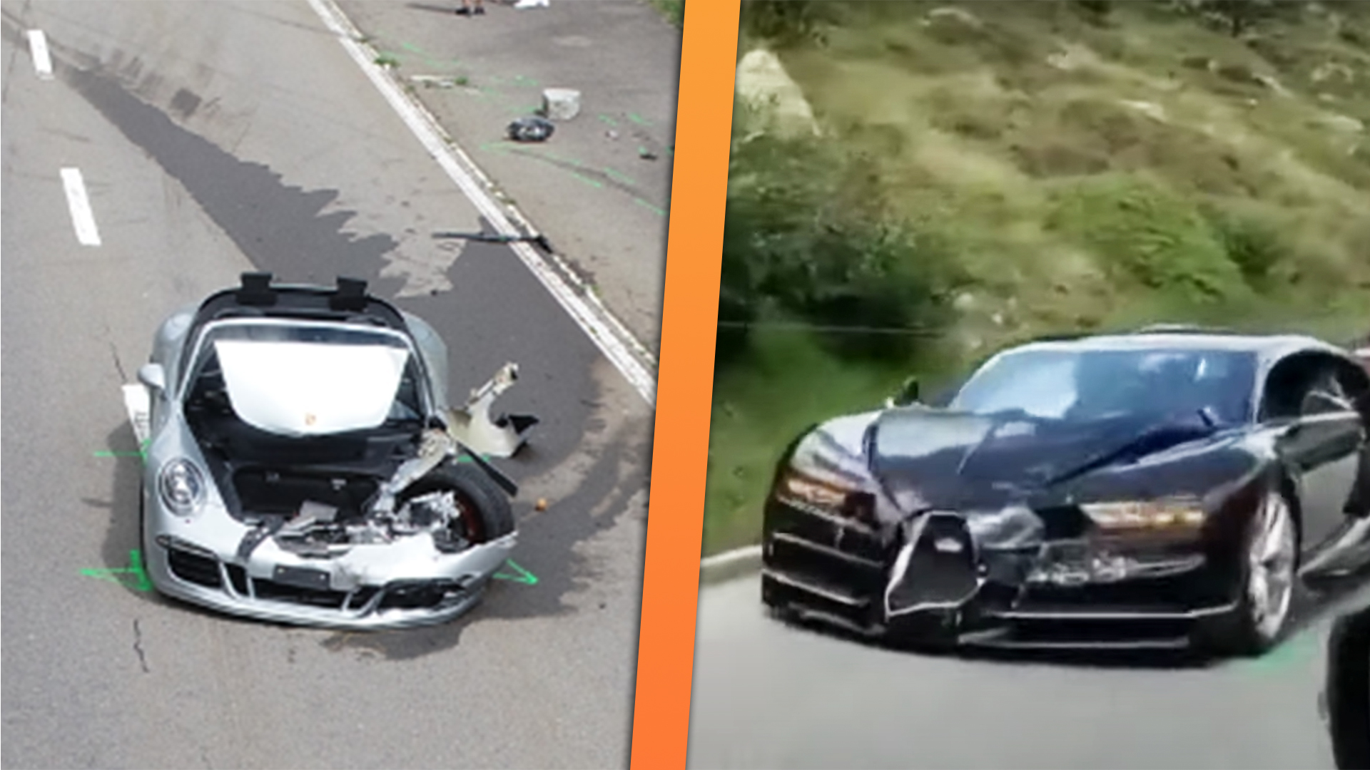 The report says both cars then crashed into column stones located on the left-hand side of the road before veering back into traffic; the Bugatti ended up striking the motorhome, while the Porsche plowed into the Mercedes-Benz wagon, a passenger from which was seriously injured in the wreck.