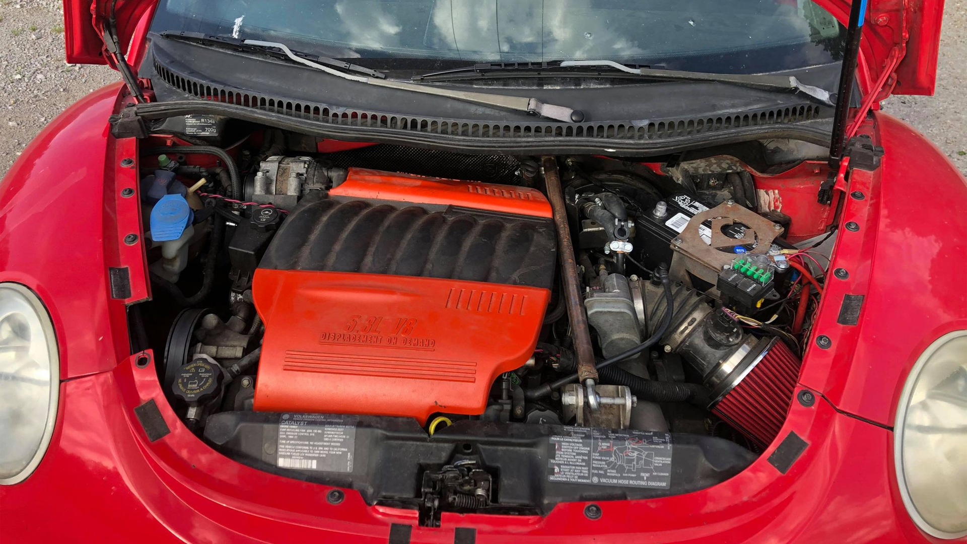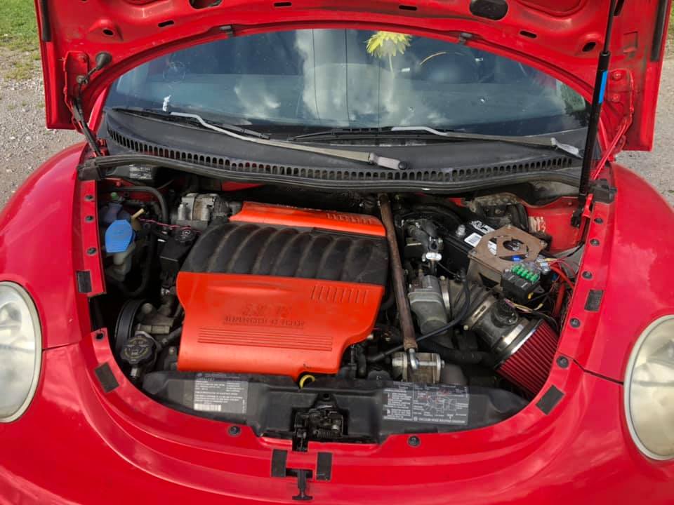 The soft and bubbly appearance of the Volkswagen New Beetle makes it one of the least menacing cars on the road. It’s not quick, nor is it particularly pleasing to look at, but perhaps throwing gobs of power and doubling the number of cylinders under the hood might make it more interesting. And in fact, that’s exactly what one madman did to change the tune from “boring” to “sleeper,” and now the world’s most muscled-up VW New Beetle is for sale.
