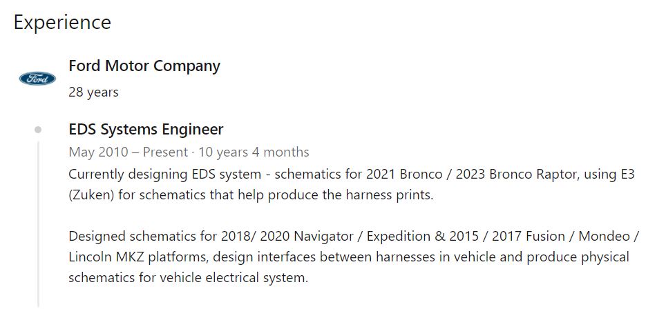 Brought to us by the folks at Bronco6G, mention of the Bronco Raptor can be found within the LinkedIn details of one Bruce A. Richter, an EDS engineer at the Ford Motor Company. “Currently designing EDS (electrical distribution system)—schematics for 2021 Bronco / 2023 Bronco Raptor,” reads Richter’s online CV.