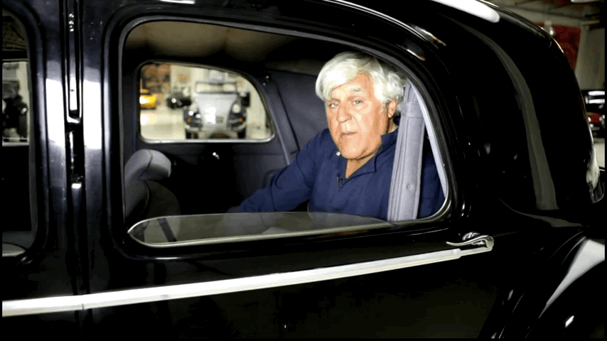 Thanks to the gearbox being in front of the engine, the Traction Avant features a completely flat floor and undercarriage, allowing for a very spacious interior despite the car’s small footprint. Demonstrating this packaging benefit is Jay Leno sitting behind himself, with the driver’s seat pushed all the way back:
