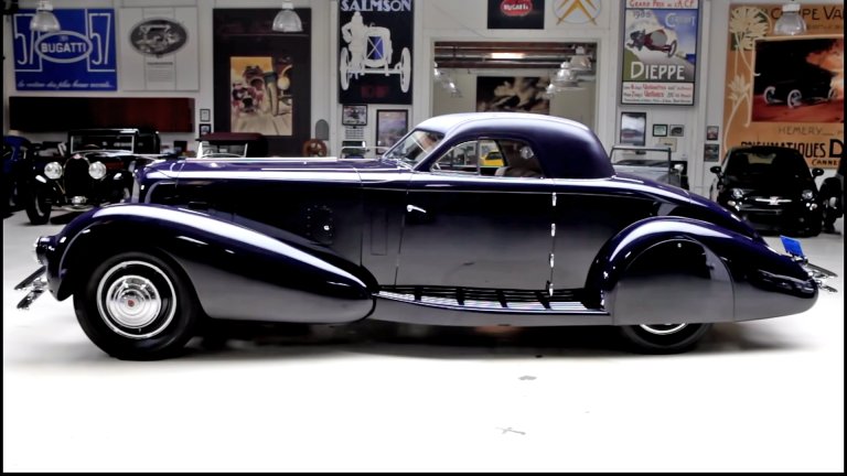 Featuring suicide doors, a banjo steering wheel, trafficators and a windshield that cranks open just like on his 1934 Chrysler Airflow, some options on the Traction Avant include the spare tire being on the trunk (which opens with the bumper), and a fishnet storage net attached to the headliner.