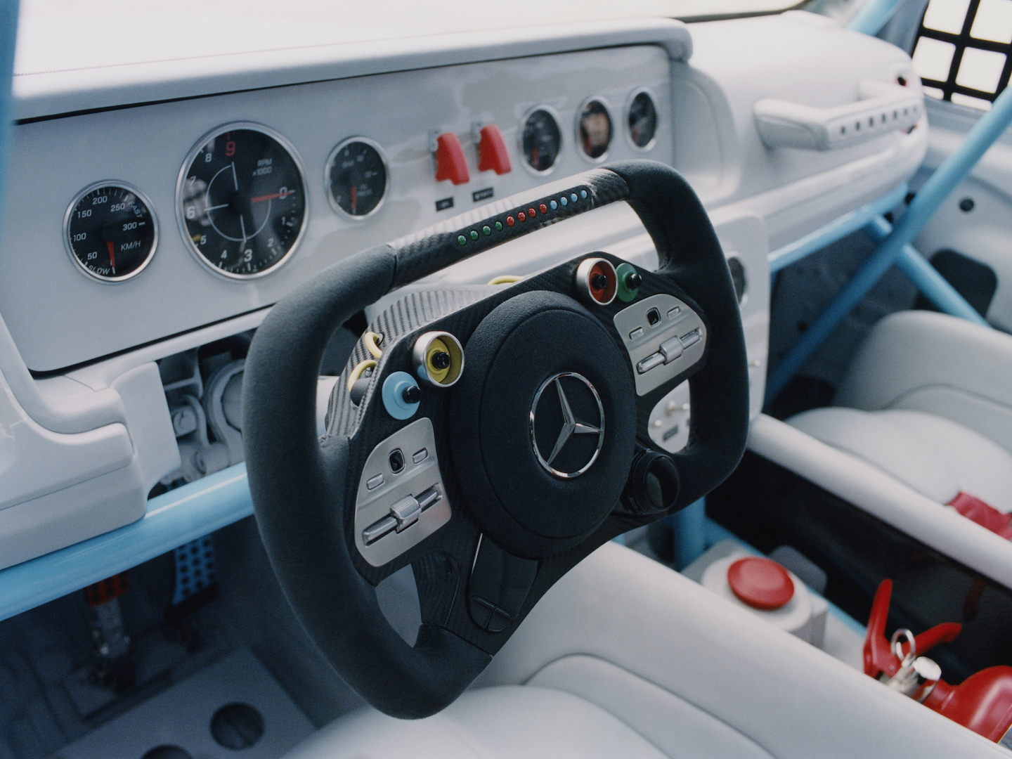 Within is a stripped-out interior, with analog gauges inspired by vintage race cars and a steering wheel that’d look at home in the Mercedes-AMG Project One hypercar. Window netting, bucket seats, and five-point racing harnesses keep driver and passenger within the confines of its roll cage—or, they would if Project Geländewagen were ever destined to hit the track. There’s a telling lack of information on Project Geländewagen’s powertrain, or if it even has a functional one, which says to us it’ll never be used for the purpose it looks to have been built: bouncing over curbs.