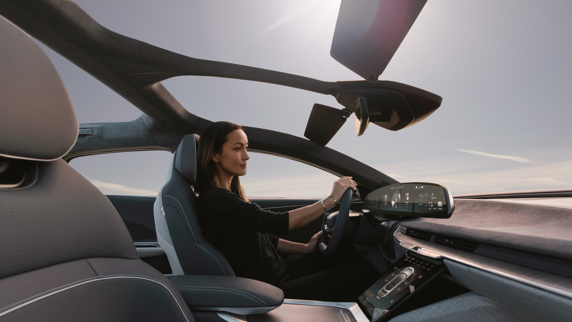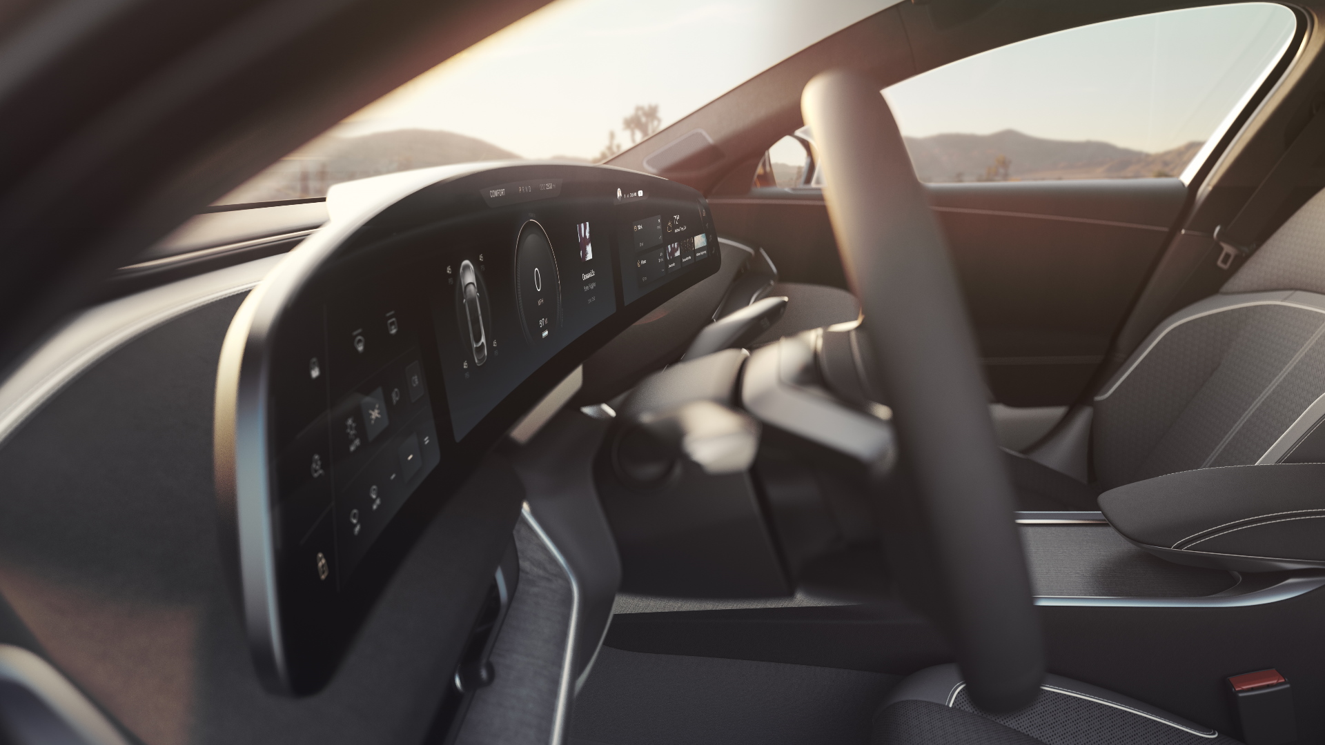 You’ll also notice some other interesting features of the car from looking at the interior shots, such as the massive, free-floating display sitting in front of the driver. It’s a 5K-resolution touchscreen, and at 34 inches, it’s nearly three feet wide. It’s complemented by another touchscreen on the center stack, which tucks back into the car’s dash when its not in use.