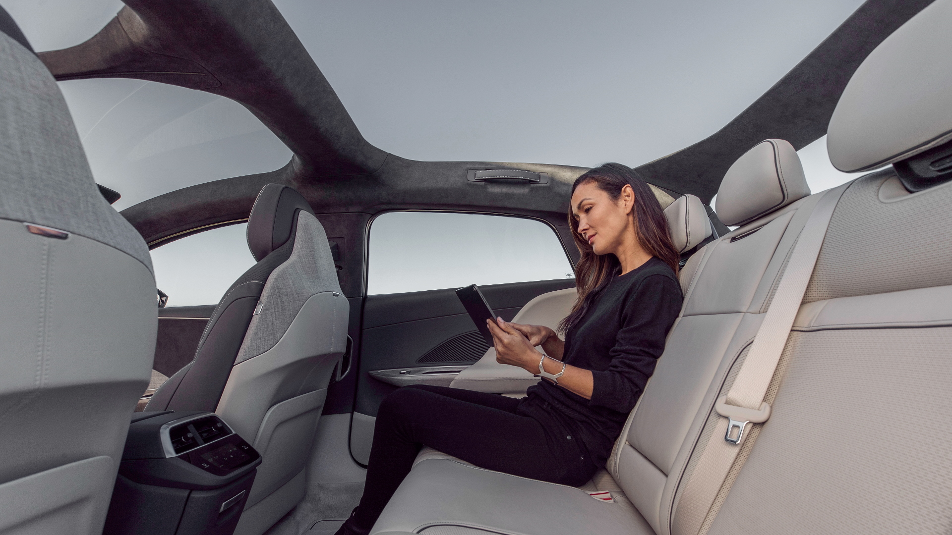 Also on display is the car’s massive panoramic windshield. It extends well behind the driver’s head, and the rear-view mirror sits on a sort of peninsula extending from the central beam connecting the two window arches of the car. The sun visors—not sure how much good they’ll do at this point—are also free-floating on the glass windshield. All of this leads me to believe the car will get rather hot, but rest assured, it has an AC compressor, and the temperature of the interior can be regulated from your phone.