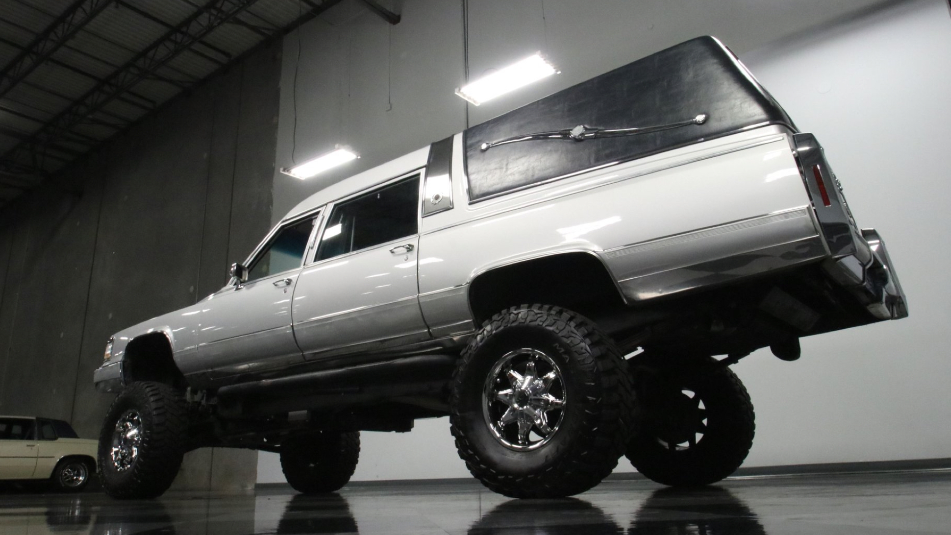Up for sale on Streetside Classics is a 1990 Cadillac Brougham hearse lifted on a Chevrolet K-10 truck chassis. I know rolling around in a lifted hearse is asking a lot from the pallbearers, but I promise not to haunt anyone this way. (Well, unless someone serves “chili” with beans in it at the reception. Then all bets are off.)