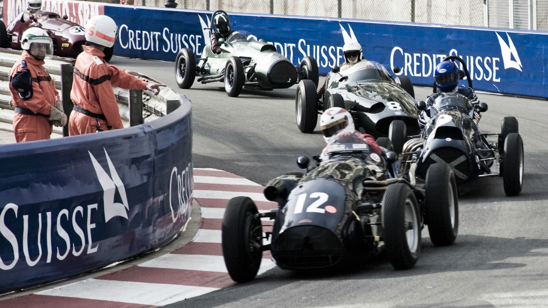 What we have here is a failure to communicate. Oblivious to the crane incident, the safety car pulls into the pits, and the grid takes off. They’re racing towards the track workers, who are scrambling to clean up the McLaren mess a few corners ahead. The safety car, a Renault Megane, realizes this, and tries speeding through pit lane to jump in front of the pack. It doesn’t work. So now there’s yellow French hatchback dicing with a field of vintage F1 cars through the streets of Monte Carlo, frantically trying to stop traffic. And that’s when shit really starts hitting the fan…