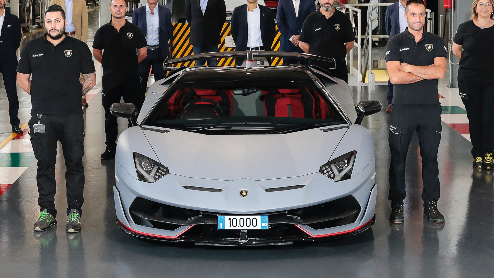 Aventador chassis number 10,000 rolled off the line today with a matte exterior in Lambo’s Grigio Acheso shade of grey. It’s an Aventador SVJ Roadster, and as such, the Rosso Alala (red) and black interior is nicely coordinated with the Rosso Mimir (also a red) accents on the outside.