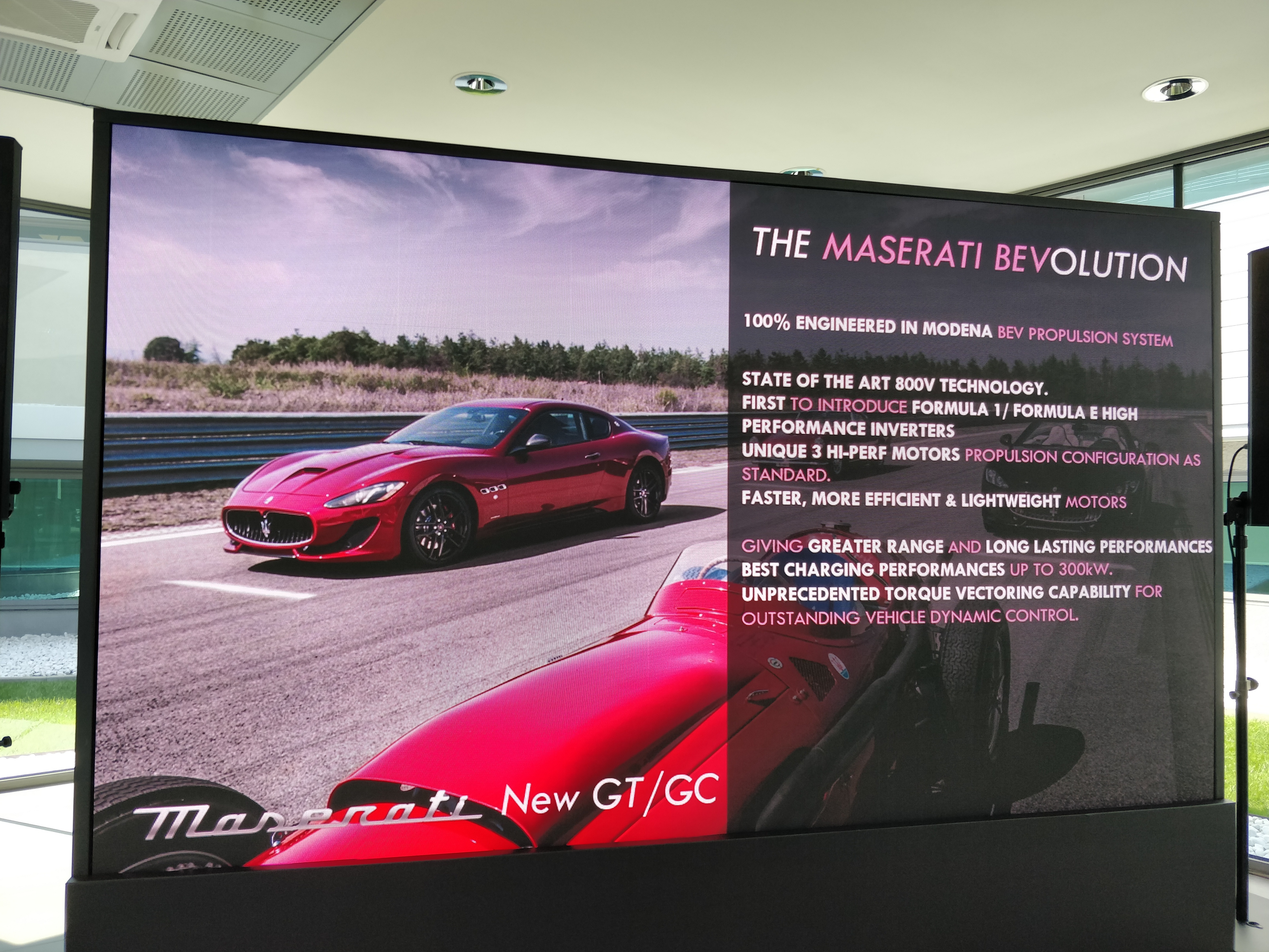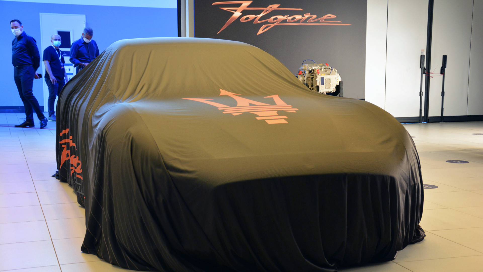 Maserati’s BEV lineup will be collectively known as the Folgore tridents (the Italian word for “lightning”), literally including all future models starting with the GT/GC (pictured underneath a sheet in this article’s lead image), the MC20 in 2022, the next-gen Quattroporte and Lavante, and the smaller Grecale SUV.