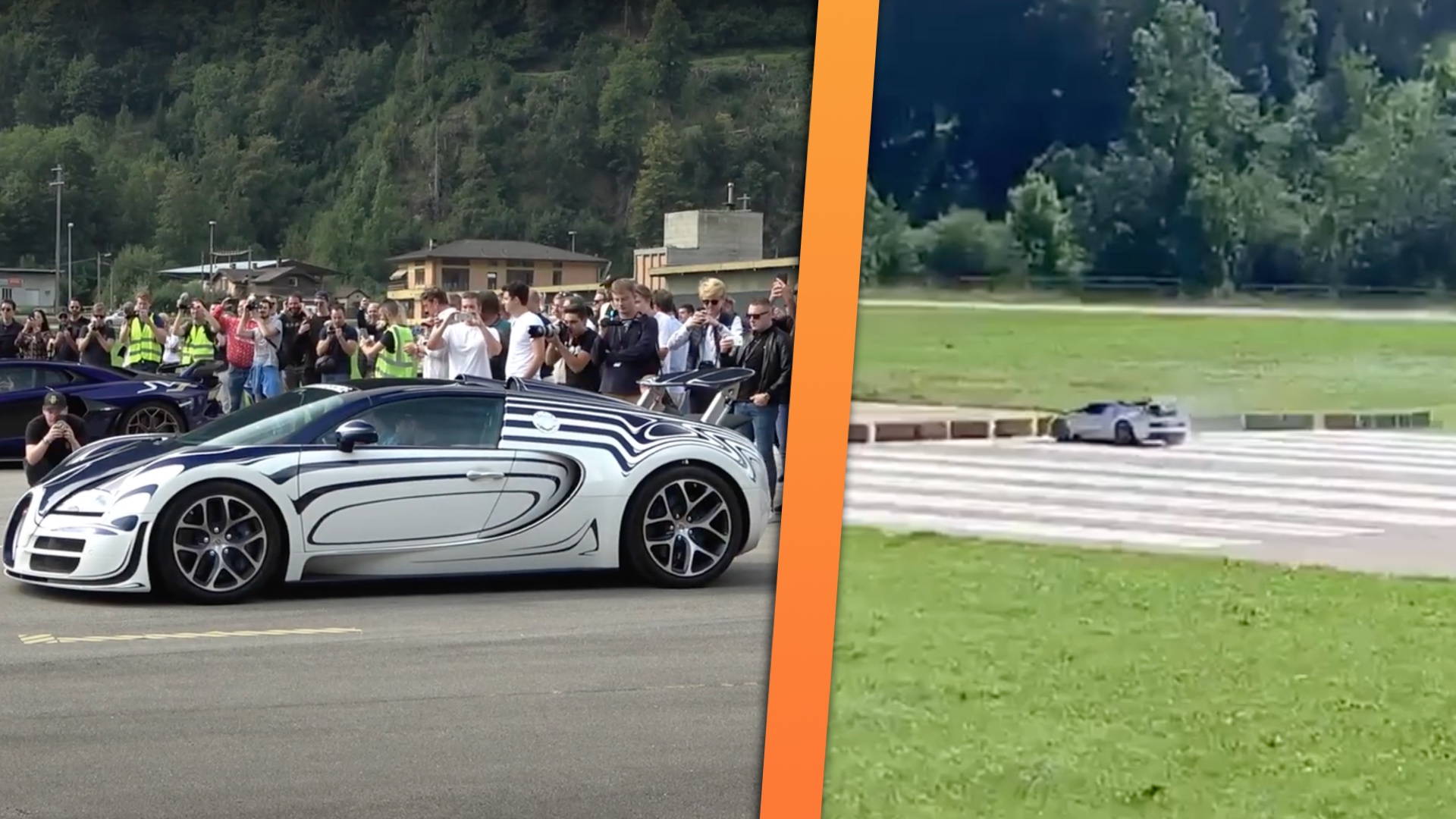 An Instagram post by The Supercar Squad shows a Bugatti Veyron crossing the finish line and then devouring a large section of the runway with its brakes squealing and puffing smoke. A second or two later, it smashes into some hay bales at the end of the runway.