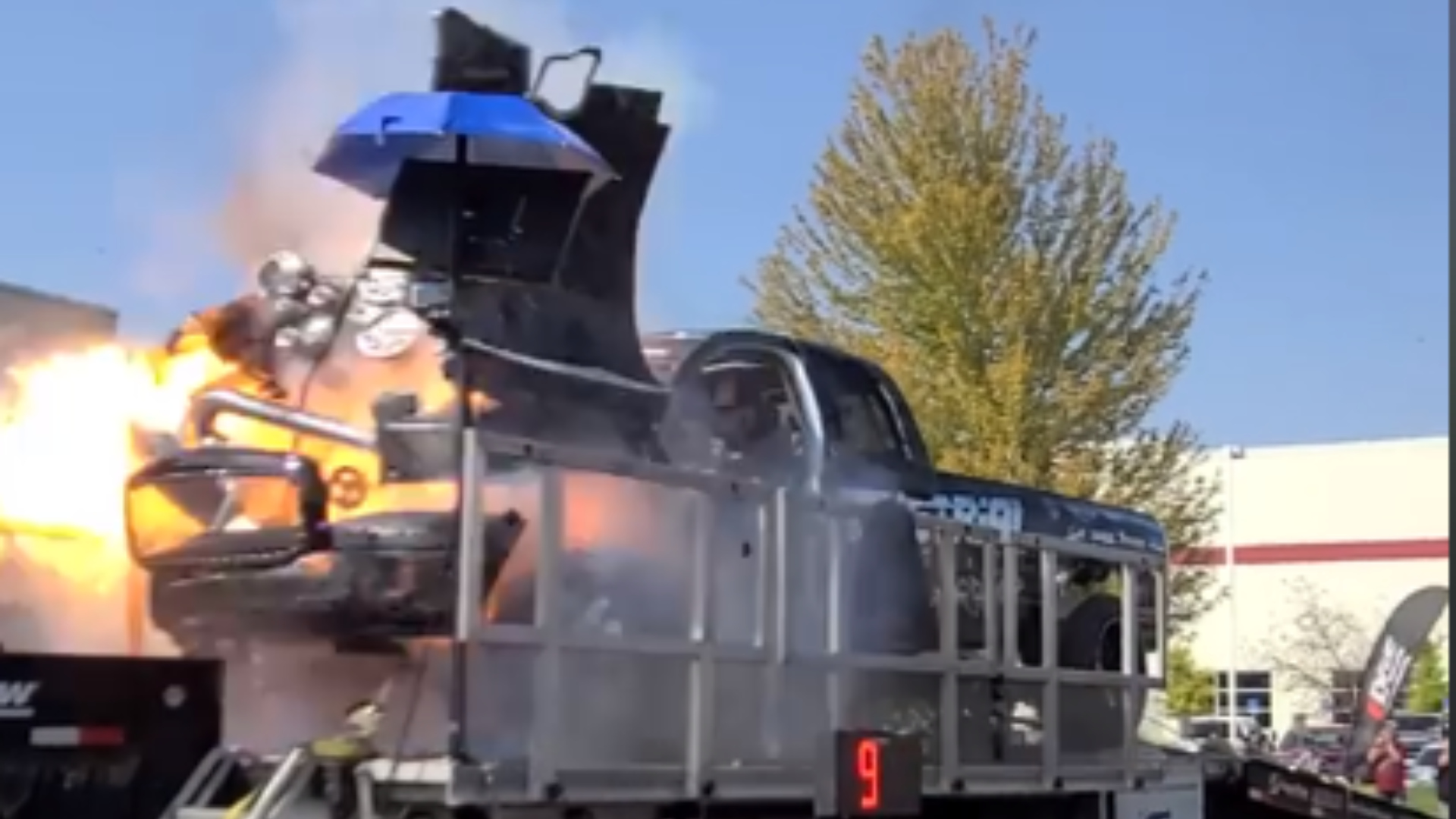 Crews quickly run to put out the fire with fire extinguishers, and you can see the charred remains of what used to be a Ram truck before the video ends. There are no details as to what went wrong. Thankfully, nobody was injured considering how many hot metal bits were sprung from the exploding engine bay.
