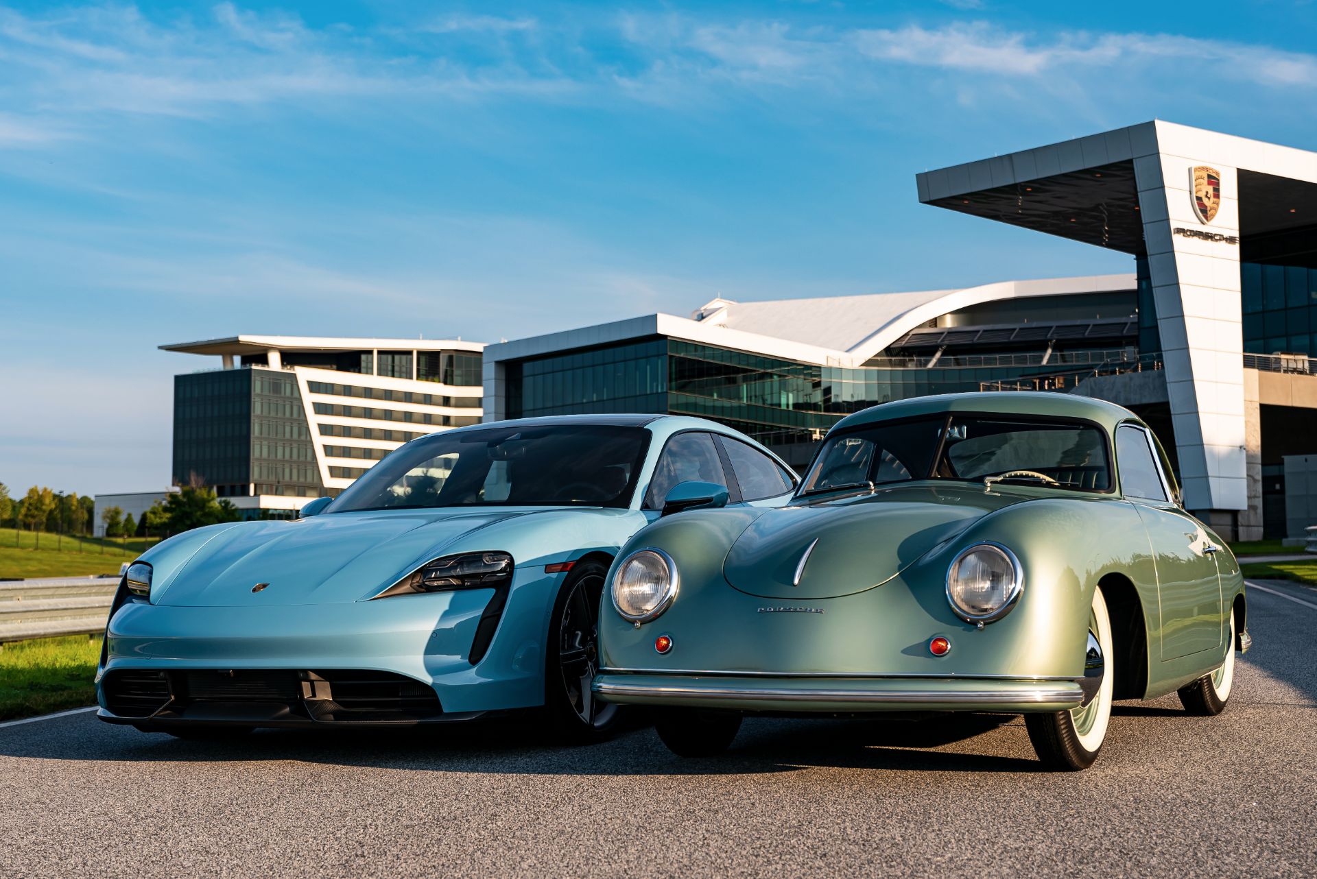 To celebrate this important 70th anniversary Porsche released this set of historic photos from its archives related to the rise of its presence in the United States, and also took some additional photos of one of their oldest cars, the 356, next to one of its newest, the Taycan Turbo S. The 356 in the new photos isn’t Max Hoffman’s, but it is a Radium Green model just like the first two delivered to Hoffman in 1950.