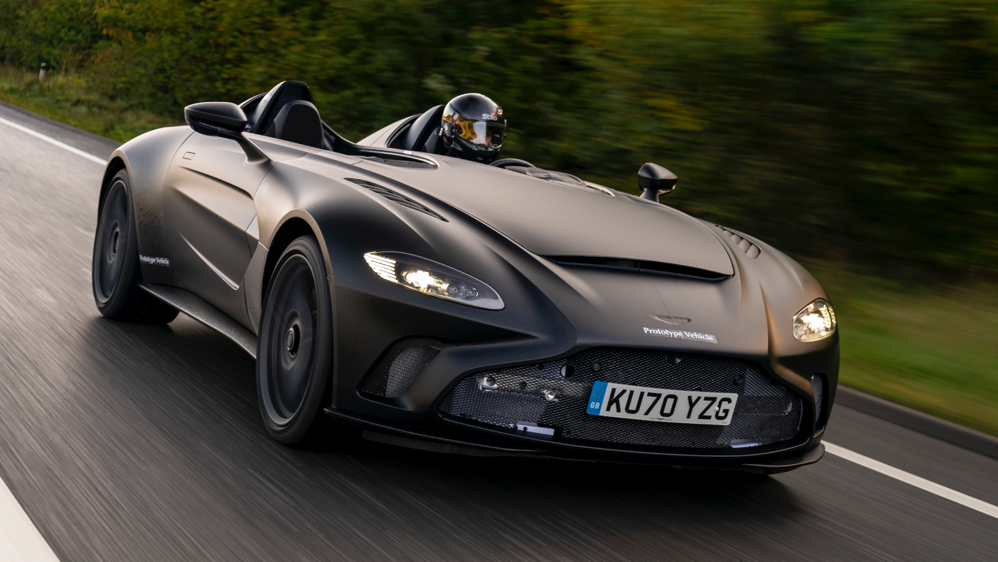 Aston Martin released photos of the first prototype V12 Speedster today, complete with a test driver in a helmet. That’s right: They’re sticking with the ultra-lightweight open-top concept.