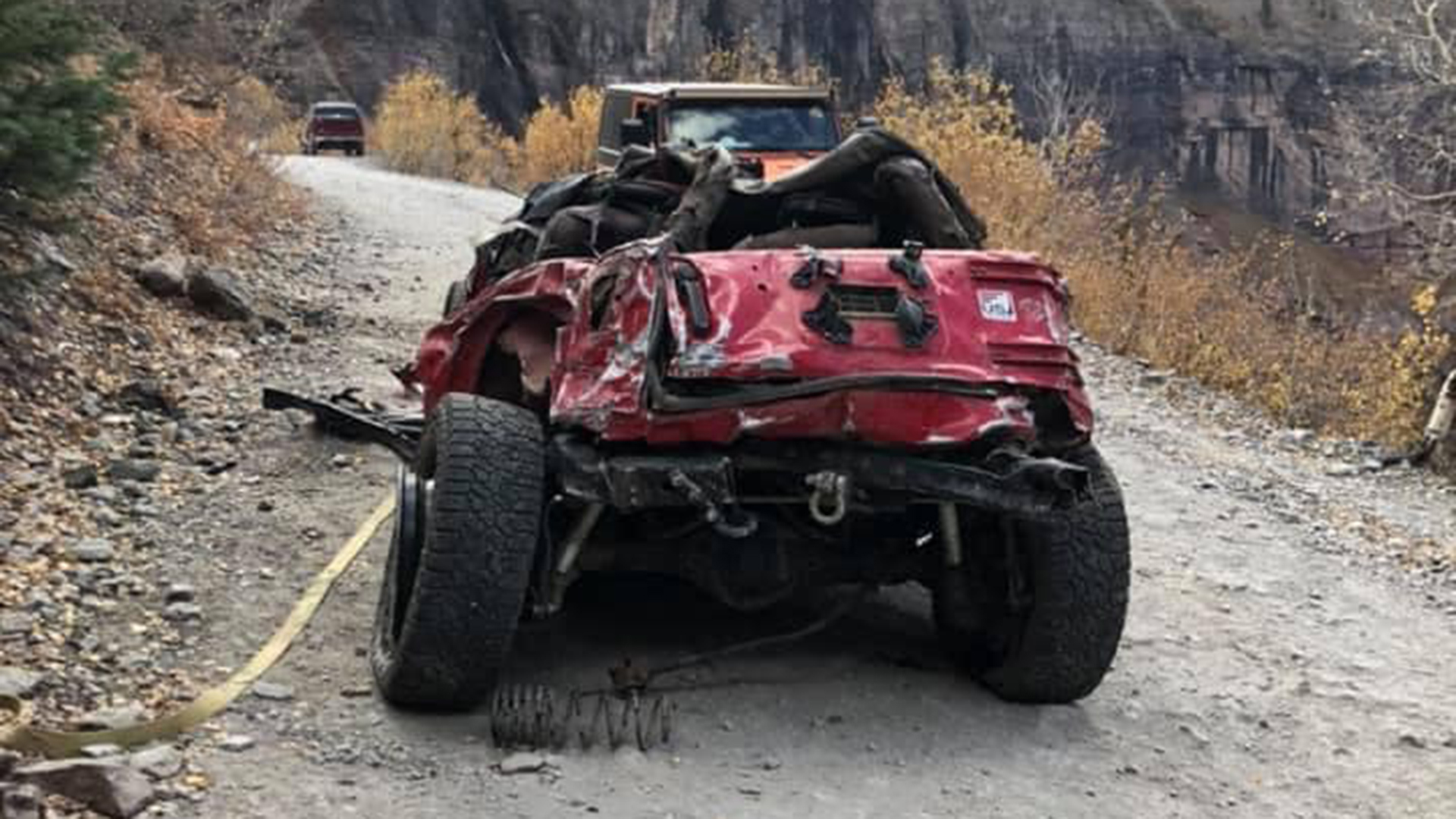 It’s a miracle the female passenger survived—she’s probably lucky to have fallen out of the vehicle as opposed to staying in it. What was left of the Jeep that landed at the bottom is not a pretty sight. It just goes to show how dangerous off-roading—especially on treacherous switchbacks like those on Black Bear pass—can be.