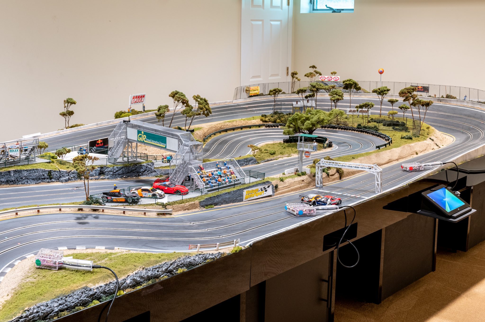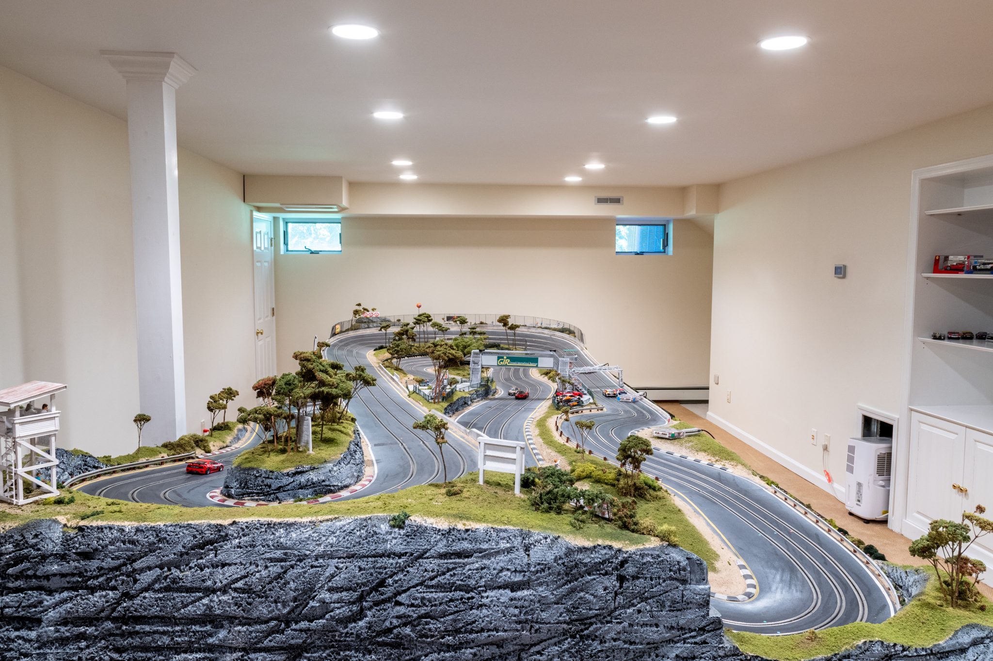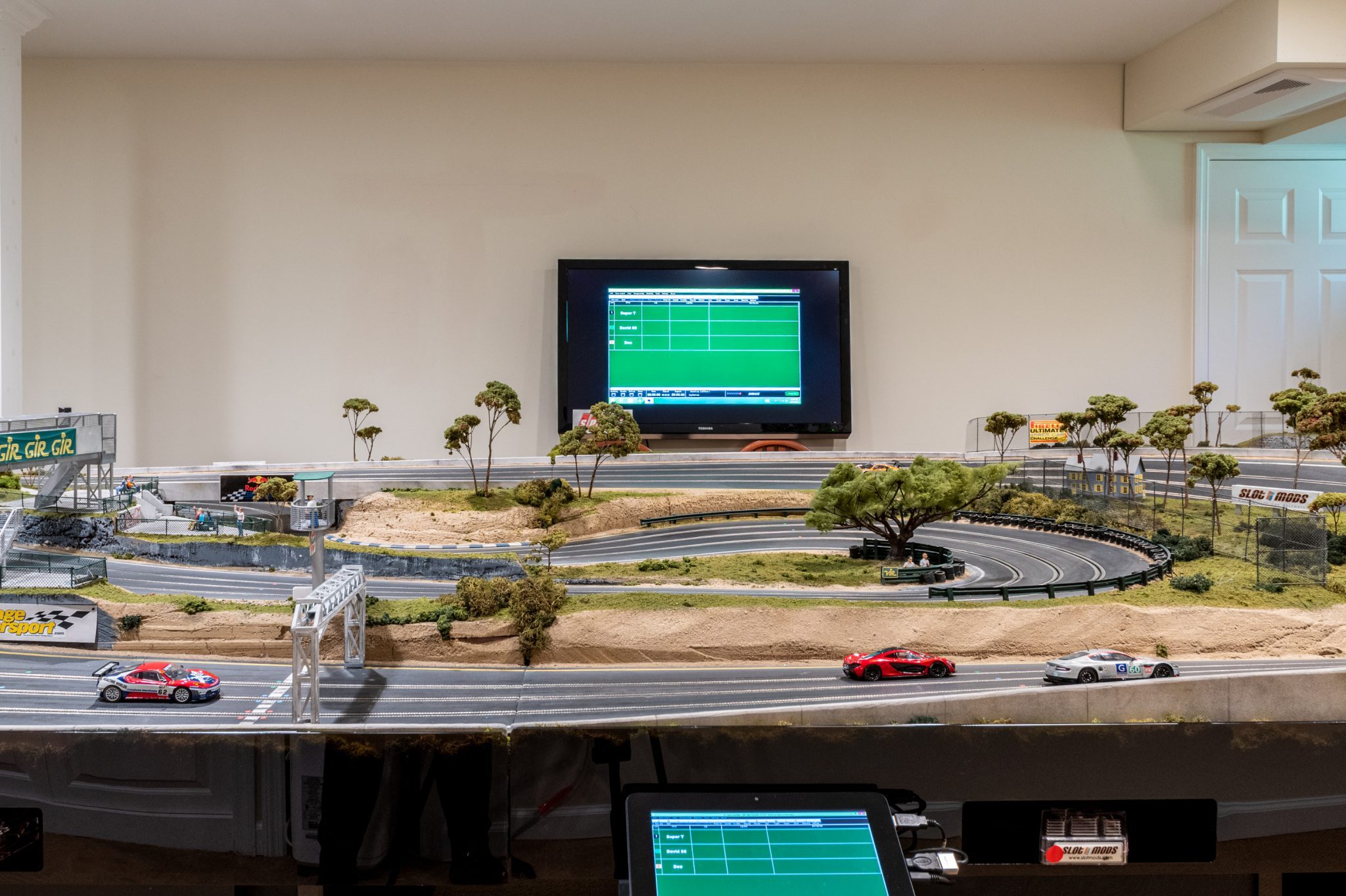 When you’re finished gawking at the miniature greenery, the track supports up to three racers, coming with three controllers and a total of 25 1:32-scale slot cars including Ferrari F430 Challenges, Porsche 911 Cup Cars, Le Mans racers new and old, and a street-spec McLaren P1. Apparently inspired by Virginia International Raceway, the elaborate slot car track’s current owner has dubbed this thing the Gussack International Raceway, or GIR for short.