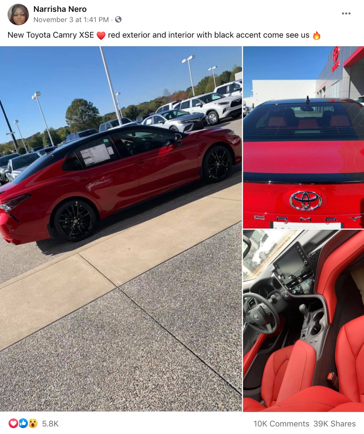 Posted earlier this week by Chuck Hutton Toyota customer service rep Narrisha Nero is a simple Facebook photo gallery made to lure buyers for a new and very red Toyota Camry XSE. “New Toyota Camry XSE red exterior and interior with black accent come see us,” it reads. It also contains three not-that-great photos of the car in question. Not the most exciting thing on the internet, to say the least.