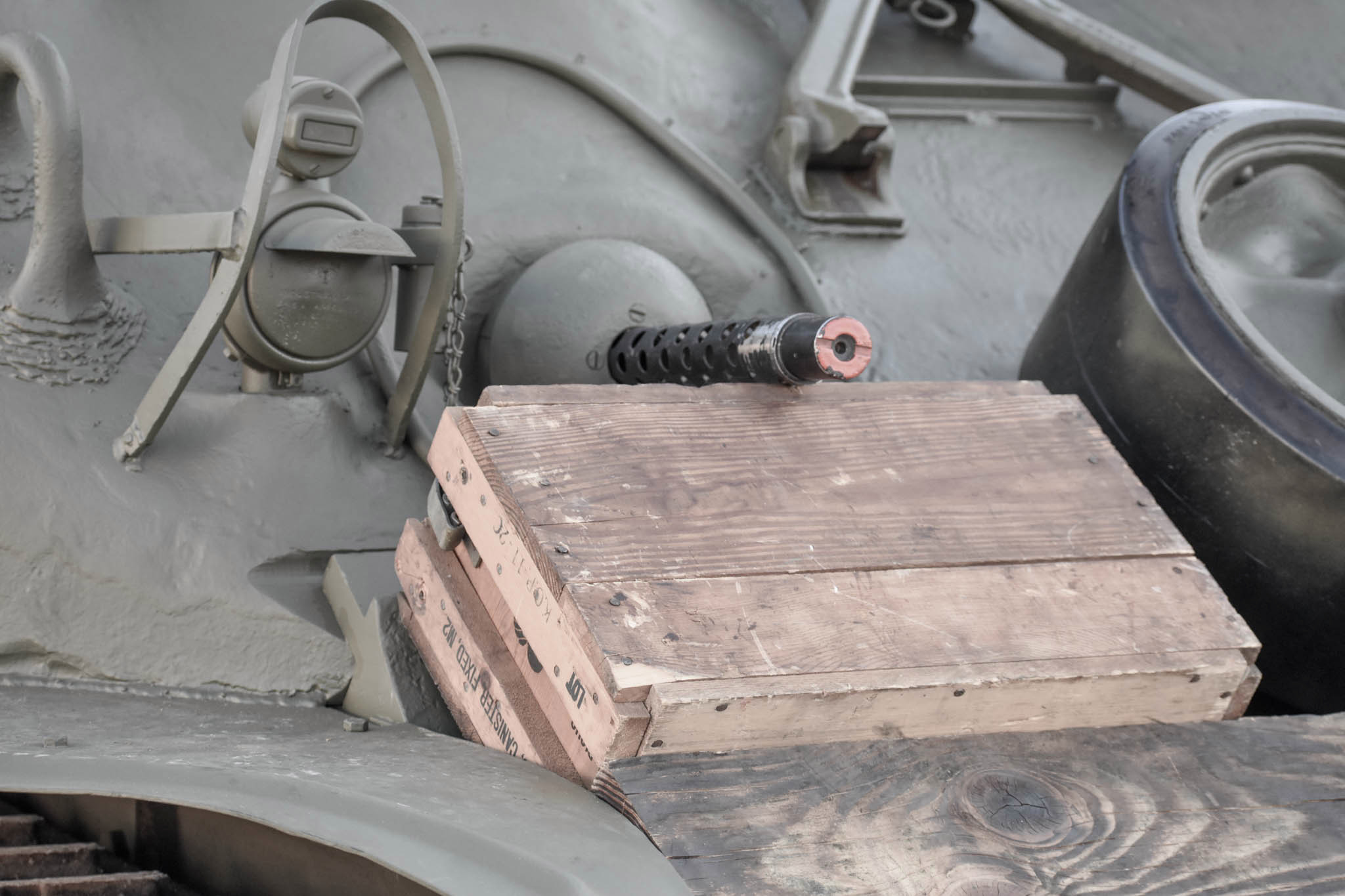 The 75-mm main gun has been demilitarized, but the tank still has some firepower. There’s a propane-fired .50-caliber replica machine gun on the turret. A dummy .30-caliber machine gun also sits on the forward hull.