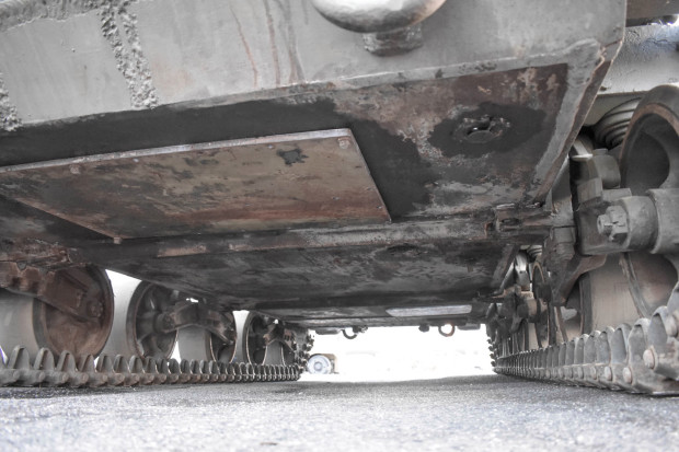 The transmission sits in the front of the tank, so a propshaft from the rear-mounted engine runs through the center fighting compartment in an enclosed housing. The upper cast hull of the tank is welded to the armor-plated lower hull of the tank, and a cast turret sits on top.