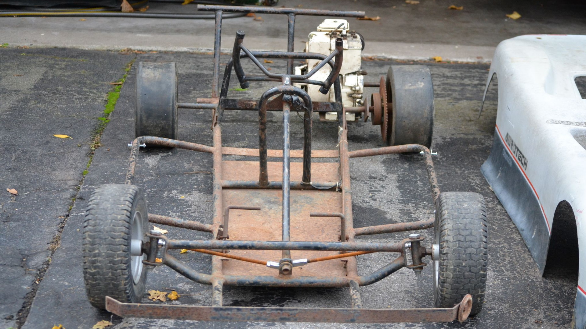 A linkage stretches back from the pedal to near the engine where a small drum or disc brake likely should be; however, those components are currently missing along with the driver’s seat. Lempert says he’s going to source a new seat while trying to keep the kart as original as possible. As far as performance goes, though, he says that while the original engine is likely to stay in the kart, the one-wheel-drive situation might have to change.