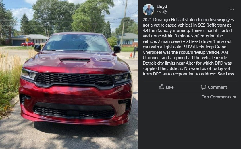 A post in the “Stolen Cars DETROIT, MI” Facebook group claimed it took thieves three minutes to break in, start, and abscond with the vehicle. According to the post, the vehicle was pinged inside the Detroit city limits via FCA’s UConnect technology (“Find My Hellcat!”) about 10 miles away from the scene of the crime. No update’s been provided, though.