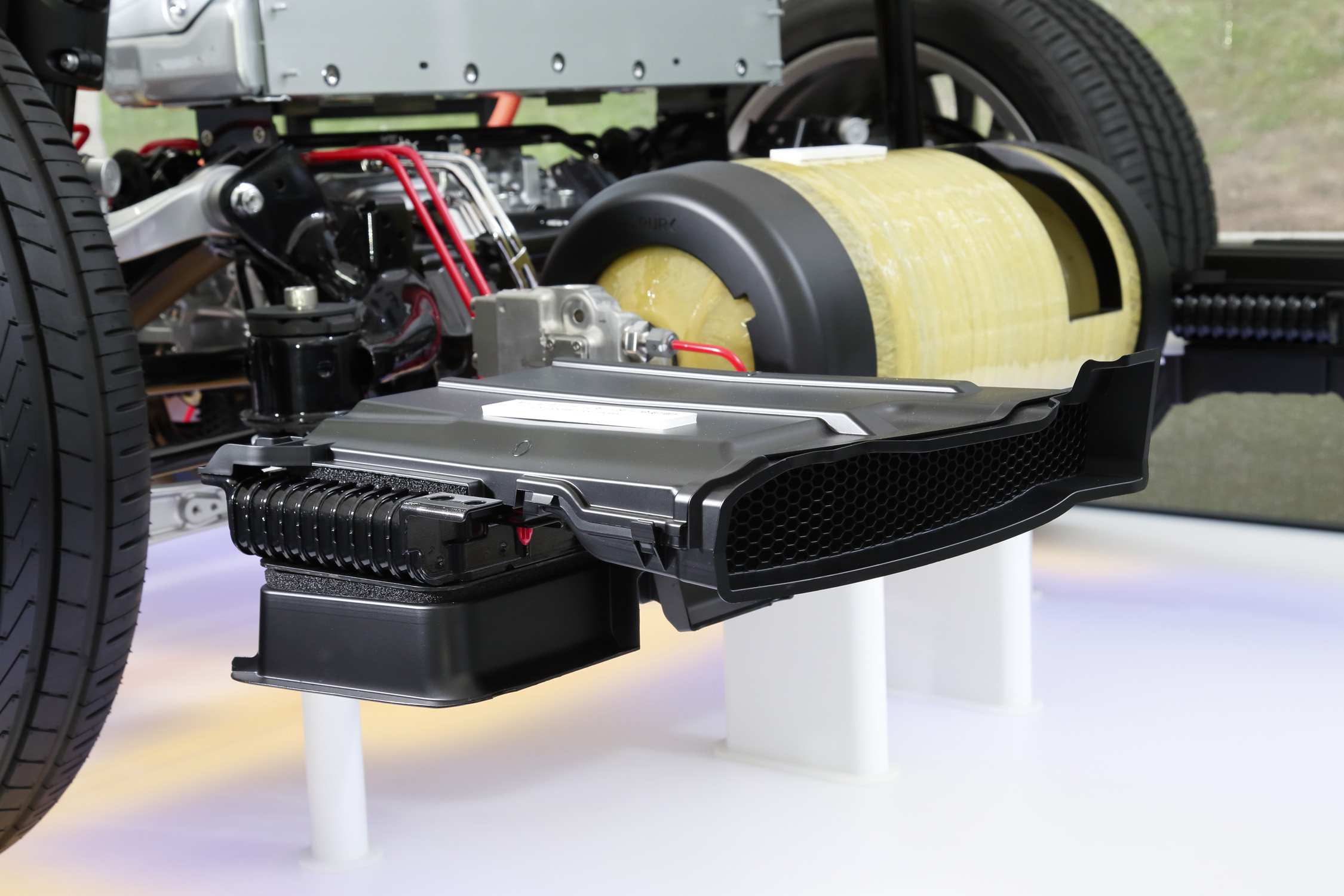 Finally, Toyota has ditched the current Mirai’s nickel-metal hydride battery in exchange for a smaller and higher voltage lithium-ion pack. 84 cells rated at 310 volts provide more energy density and higher output. The overall weight of the battery pack has been reduced by five pounds.