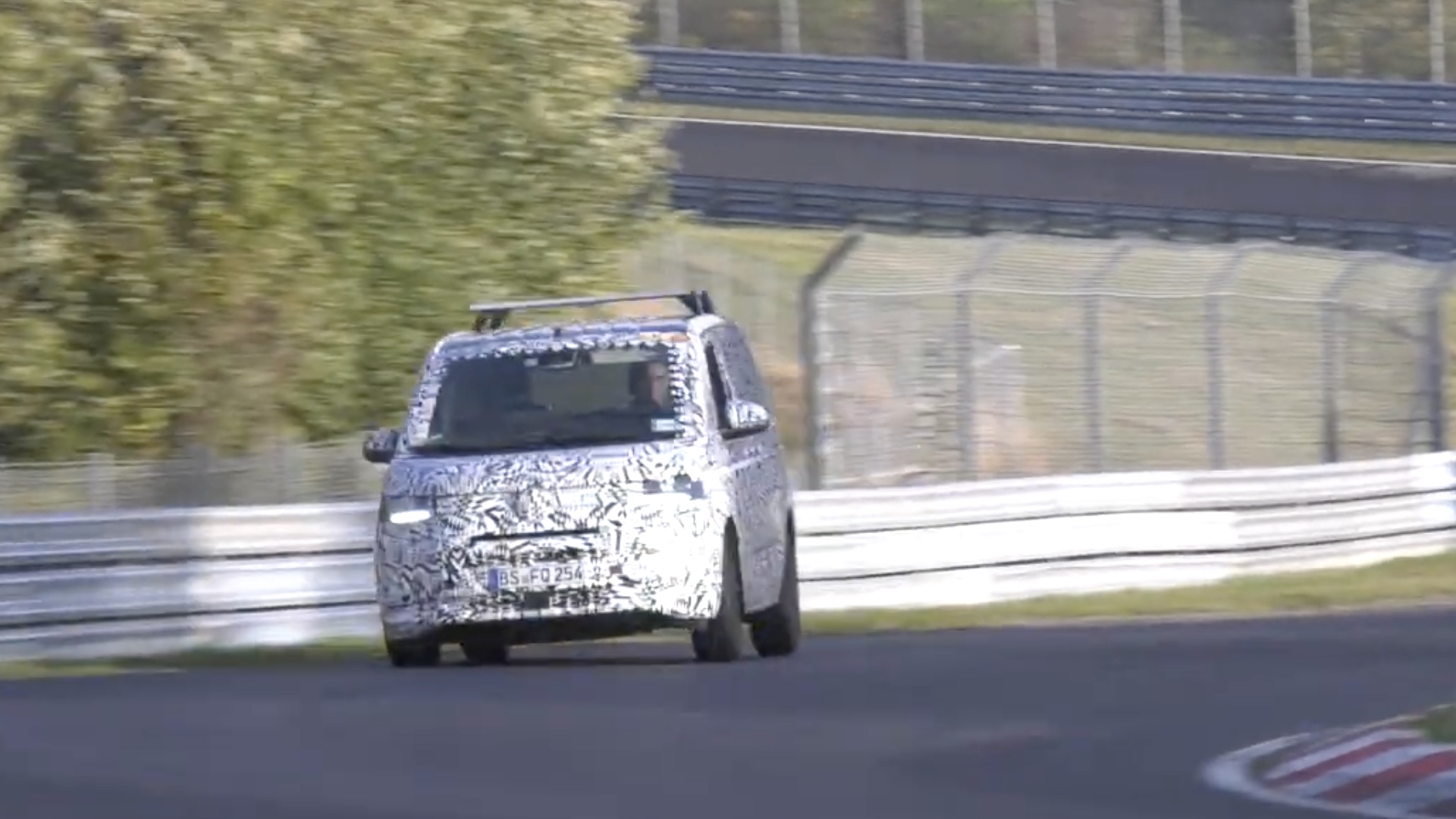 The new “T7” Transporter was captured by YouTube channel CarSpyMedia lapping on what’s presumably an industry pool day, when registered automakers alone are allowed on the track. Its full camouflage, however, does little to hide its big, round badge up front and a silhouette that’s the spitting image of less-camouflaged Transporters already seen in public. In its few brief flybys, the Transporter can be seen taking curbs like a touring car and screeching its tires all the way through corners, sometimes even rotating on entry—that driver is really thrashing it.