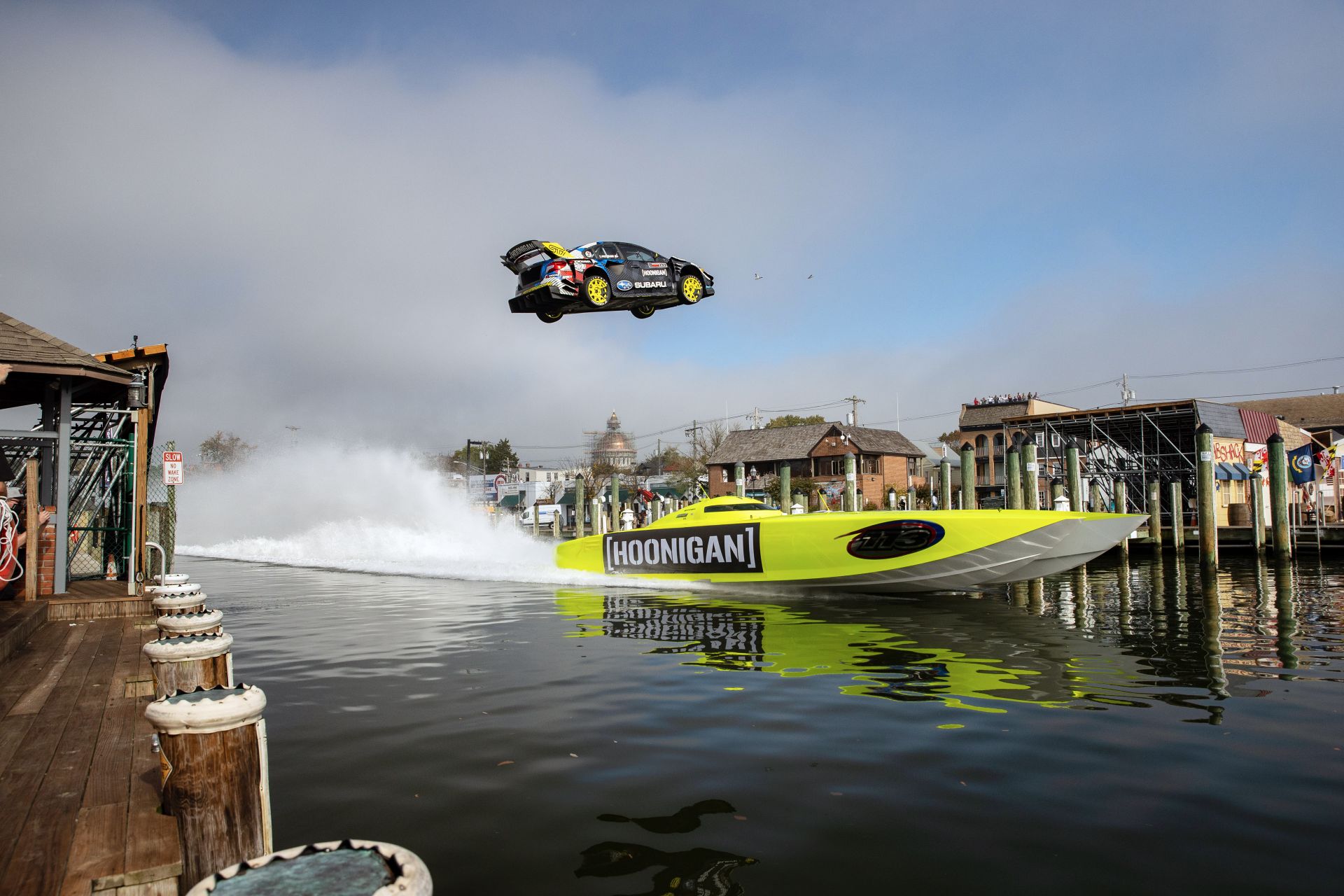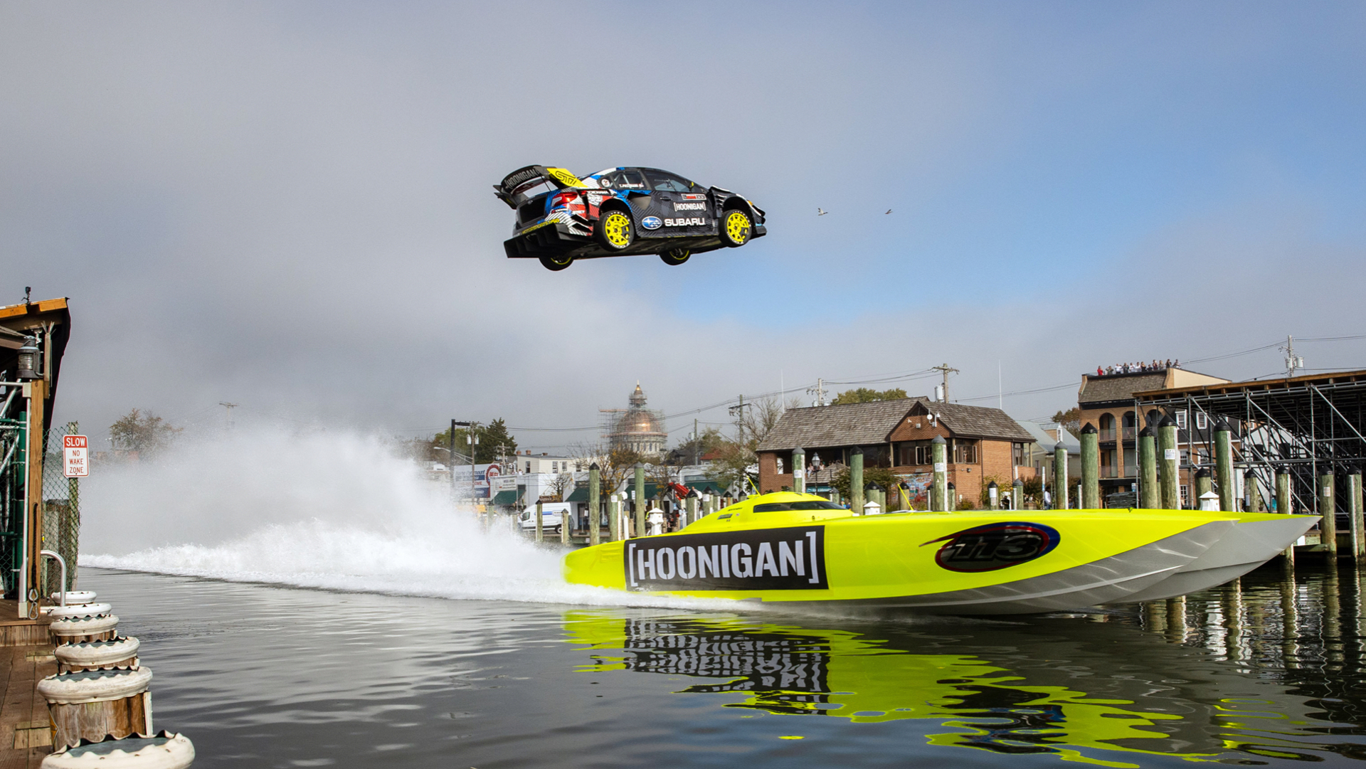 This could be the wildest Gymkhana yet, as it includes a 120-foot jump across Annapolis’ Ego Alley waterway, a waterfront donut where the car hangs further out over the water than Block’s did in Gymkhana Nine, a 360-degree spin-jump-combo under a Red Bull Air Race plane, and of course, a 150-mph jump on a country road outside Pastrana’s childhood home.